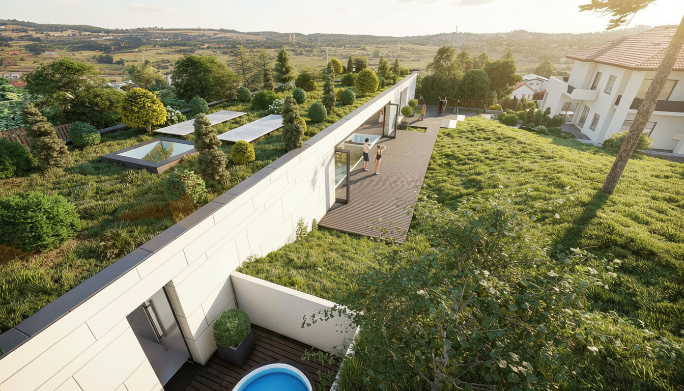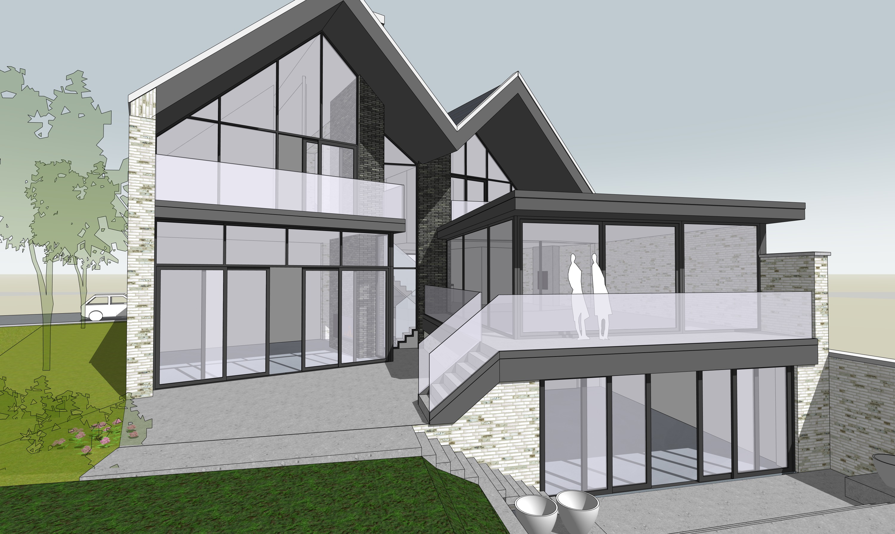 the weather is sunny with a few clouds in the sky add some people and furniture on the low terraces only 2 people standing on the higher terrace