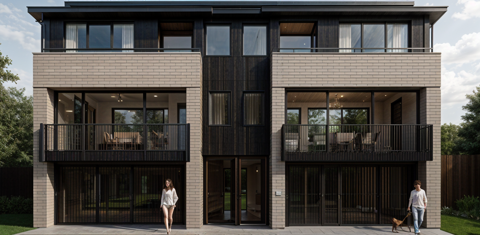 there is no garage door facing the front it is a window surrounded with 2 different tones of stucco the lower left should project about 18 past the upper the upper left with the stone column should project about 10 past the balcony