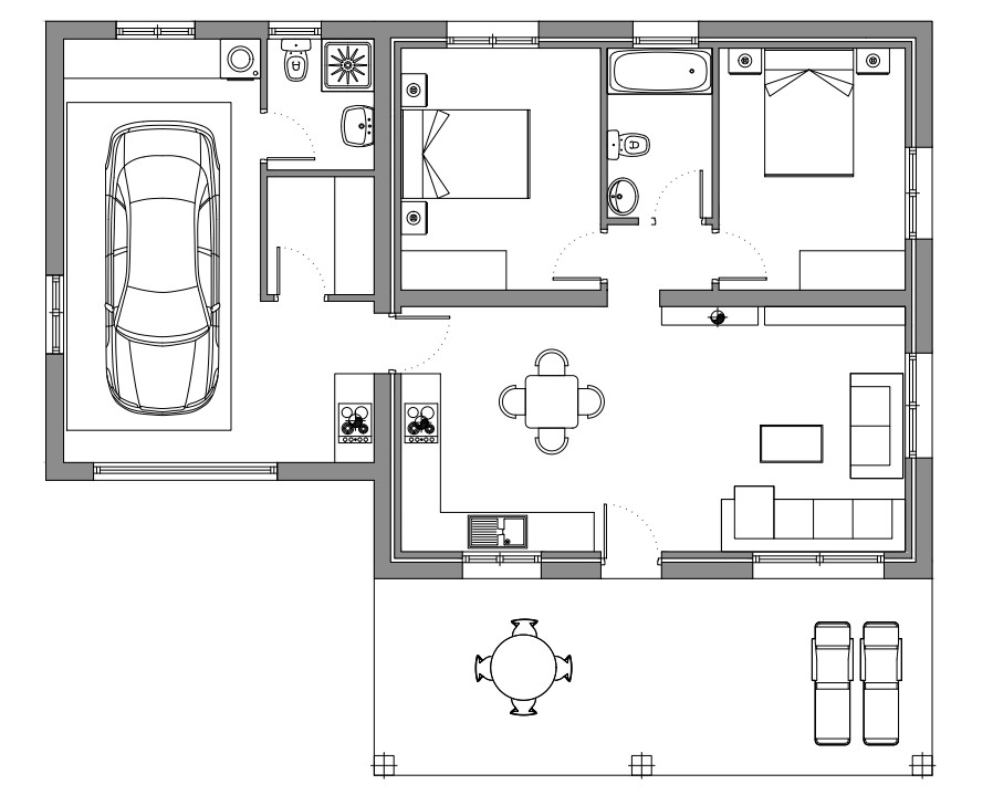 convert this floor plan into a architectural isometric 3d view of a full house show the space from an elevated angle with furniture walls and details visible vivienda con garaje y porche delantero use the same furniture as shows on the plan do not change the orientation of the floorplan