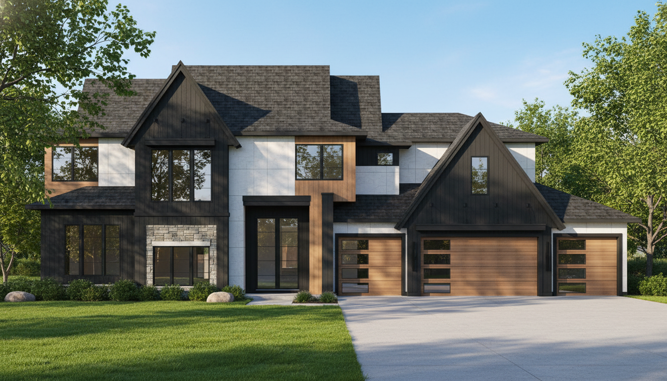 create a photorealistic architectural rendering based on the provided elevation drawing rebuild the home in the style and material quality of the inspiration image but in a bright daytime setting maintain all architectural elements rooflines and material placement from the input elevation use realistic textures for the dark vertical siding warm natural wood accents light stone details and black framed windows showcase the wood garage doors with natural light reflections illuminate the scene with strong clear daylight coming from the right side of the photo creating directional shadows that fall to the left highlight right facing walls trim and roof surfaces with bright sun and allow soft shadowing on the left portions of the home place large mature trees on both sides of the house with lush green foliage ensuring they frame the home without blocking the architecture use a bright blue sky with soft scattered clouds keep interior lighting subtle allowing natural daylight to dominate include a clean concrete driveway and walkway neatly edged lawn low modern shrubs and boulders render the scene with crisp high end architectural photography quality clear details and balanced exposure architecture