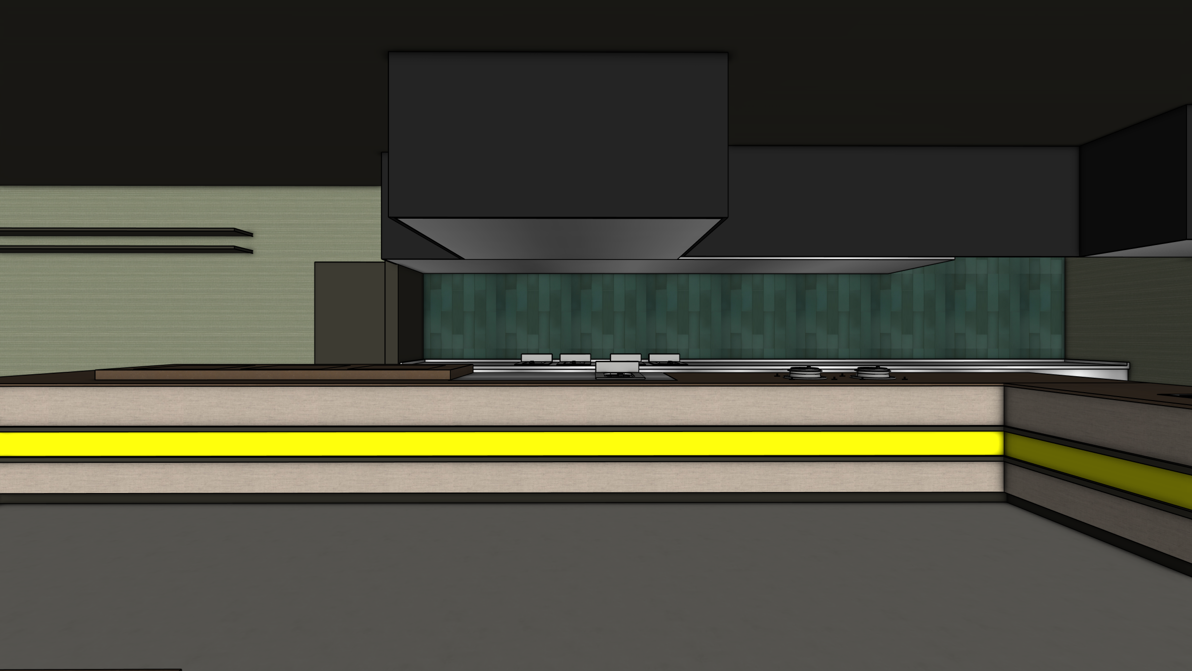 photorealistic interior architectural render of a modern high end warm buffet counter in a stylish restaurant setting warm inviting and luxurious atmosphere with soft architectural lighting the main front counter features a distinct horizontal paneled design the horizontal borders and framing edges that divide the sections are finished in a soft warm earthy taupe paint within this framing the top and bottom horizontal panels are clad in a premium warm beige grey textured material with a subtle fabric like finish the middle horizontal band is entirely dedicated to sleek dark horizontal slatted ventilation grilles beautifully accented by a warm hidden led strip light the countertop is a rich dark brown natural stone and quartz material with an elegant high quality finish the back wall above the rear counter is covered in vertical glossy dark green rectangular tiles the wall on the far left features a high quality heavily textured muted green wallcovering the floor is a seamless soft beige poured concrete floor dark modern ceiling with sleek black extractor hoods suspended above active culinary scene with restaurant staff behind the counter on the left side of the counter there are beautifully lit displays of warm meals toasted sandwiches and snacks in the center right area under the hoods there is a dedicated soup station featuring elegant soup tureens highly detailed materials hyperrealistic 8k resolution cinematic lighting octane render beautiful reflections