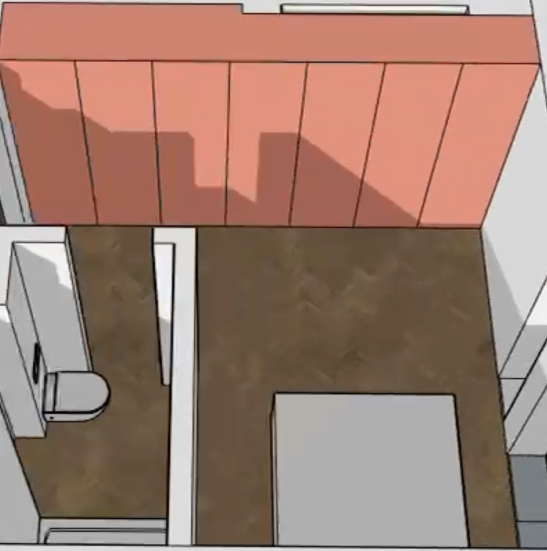the red block needs to be a plastered in off white built in storage wall with doors architecture