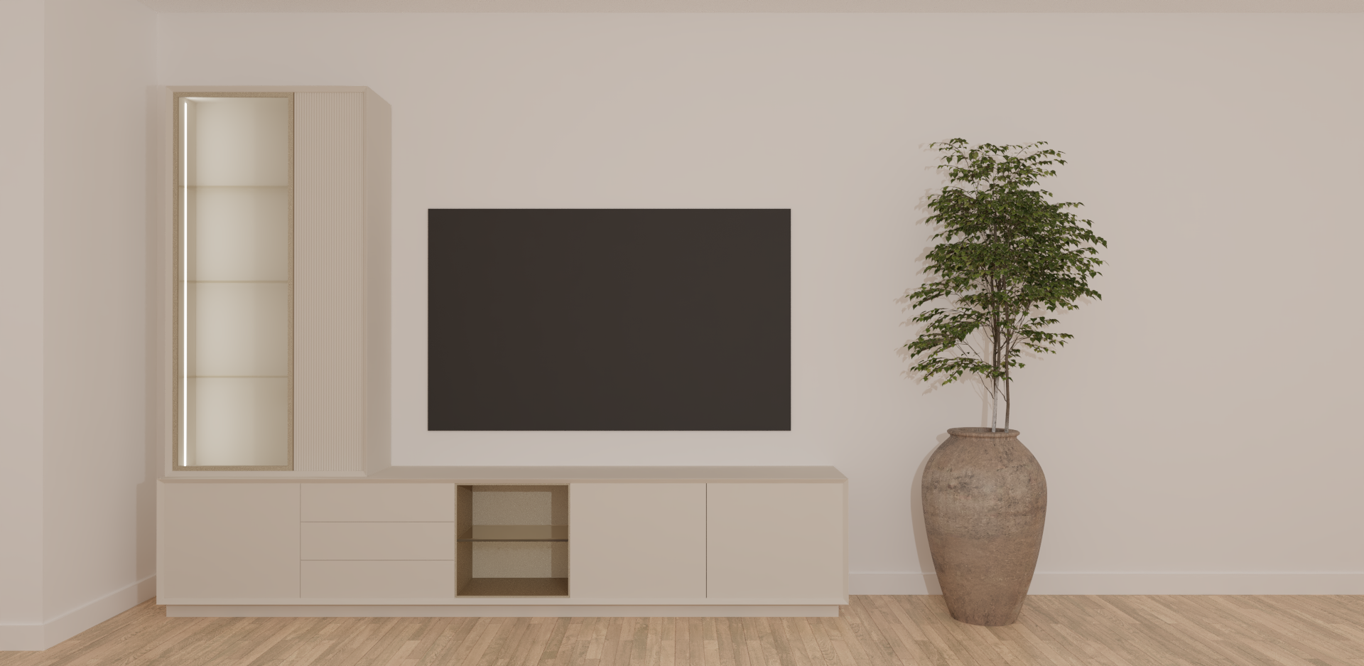 mejora esta imagen en cuanto a textura y calidad de l aimagen debe tener aspecto de imagen fotorealista profesional iluminacion natural y a ade algun detalle de decoracion estilo minimalista no modifiques el mobiliario el vidrio de la vitrina debe ser parsol bronce pero ojo no modifiques el color del marco de la puerta de la vitrina debe ser chmapange poca decoracion
