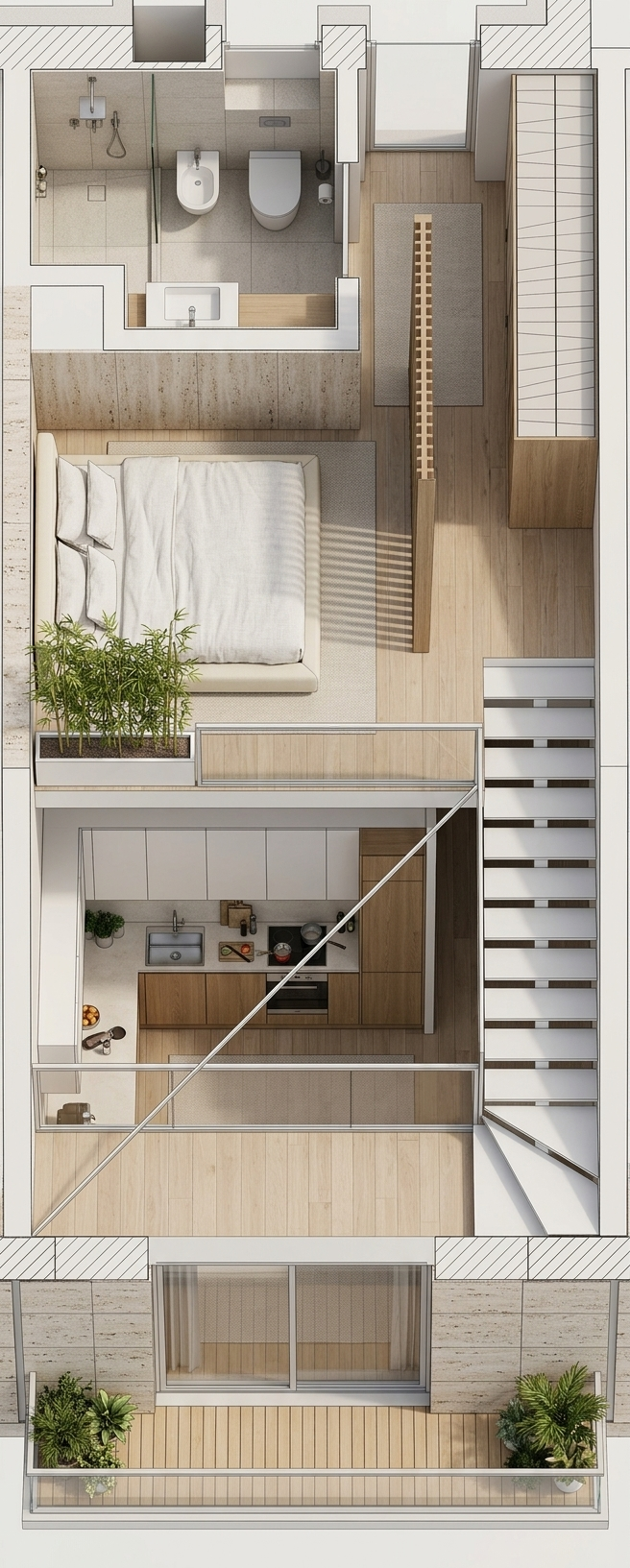 a precise hyper realistic architectural visualization capturing the dog shower and utility corner seen in image 22 png from the identical camera perspective the entire ceiling is now a consistent smooth textured soft beige concrete finish matching the tone and texture of the primary upper walls bathed in a soft warm light emanating from the single precisely focused recessed ceiling spotlight casting subtle highlights and deep rich textures throughout the material rendering is crucial and must be exact the primary upper walls are a textured smooth soft beige concrete finish with a matching soft beige tiled wainscoting and dog wash station clad in large format ceppo di gr ivory stone tiles ivory and grey aggregate stone the foreground counter is topped with the ceppo di gr ivory stone the cabinetry fronts beneath the sink exactly as positioned are meticulously finished with the specific decolegno penelope fa44 textured linear wood laminate with its distinct grain running horizontally matching the warm tone the bronze steel and glass partition frame on the left is rendered with its specific metallic finish all other fixtures and placements including the dog shower spray and the modern bronze finished sink tap are identical to image 22 png with no objects added or removed only the material finishes strictly defined and illuminated by the beautiful soft spotlight perspective is an exact match
