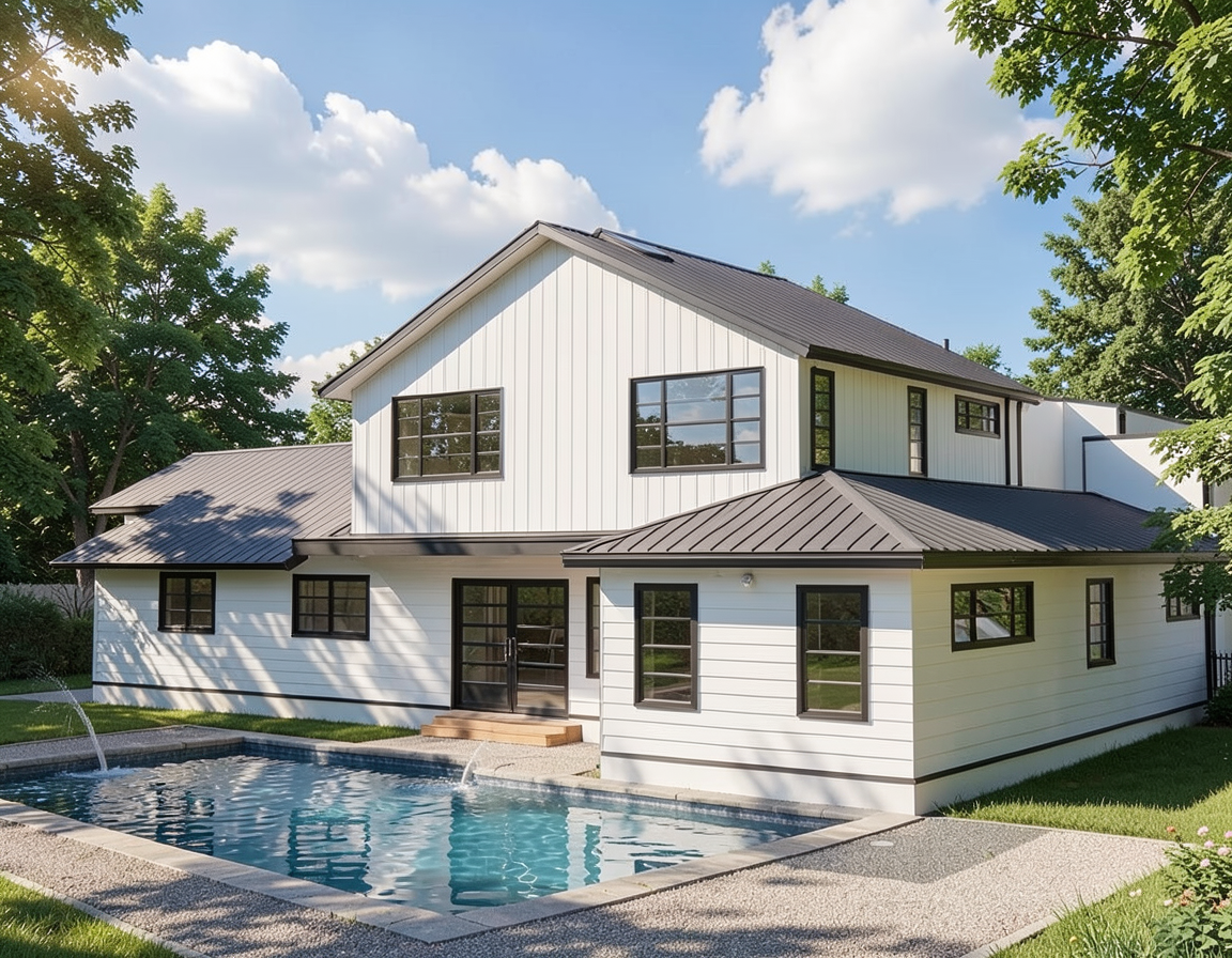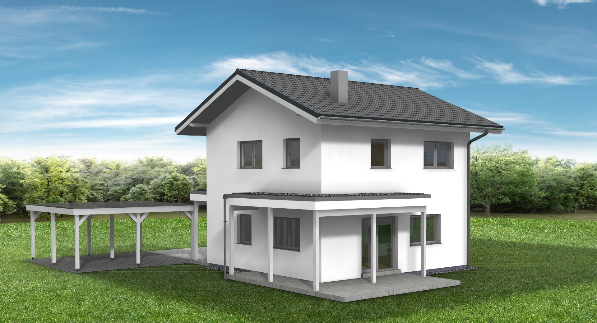 erstelle f r exakt dieses haus eine realistische au enansicht dach anthrazit fassade wei fenster und haust re hellgrau das haus soll in einem dezent modernen garten situiert sein behalte alle ma e und farben des hauses exakt bei