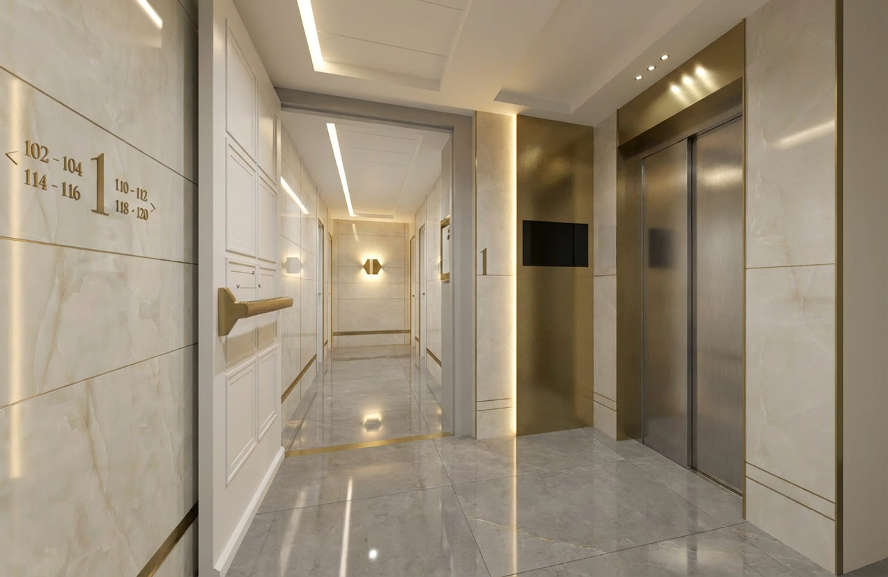 strip led verticale verso il numero 1 dal pannello in verticale applique biemissione in fondo gres lucido dettagli in ottone satinato porte ascensore in acciaio satinato mantieni moquette a terra accendi schermo strip led a parete lungo il corridoio bassa incassata nel profilo ottone pannello dove c schermo tv in ottone satinato