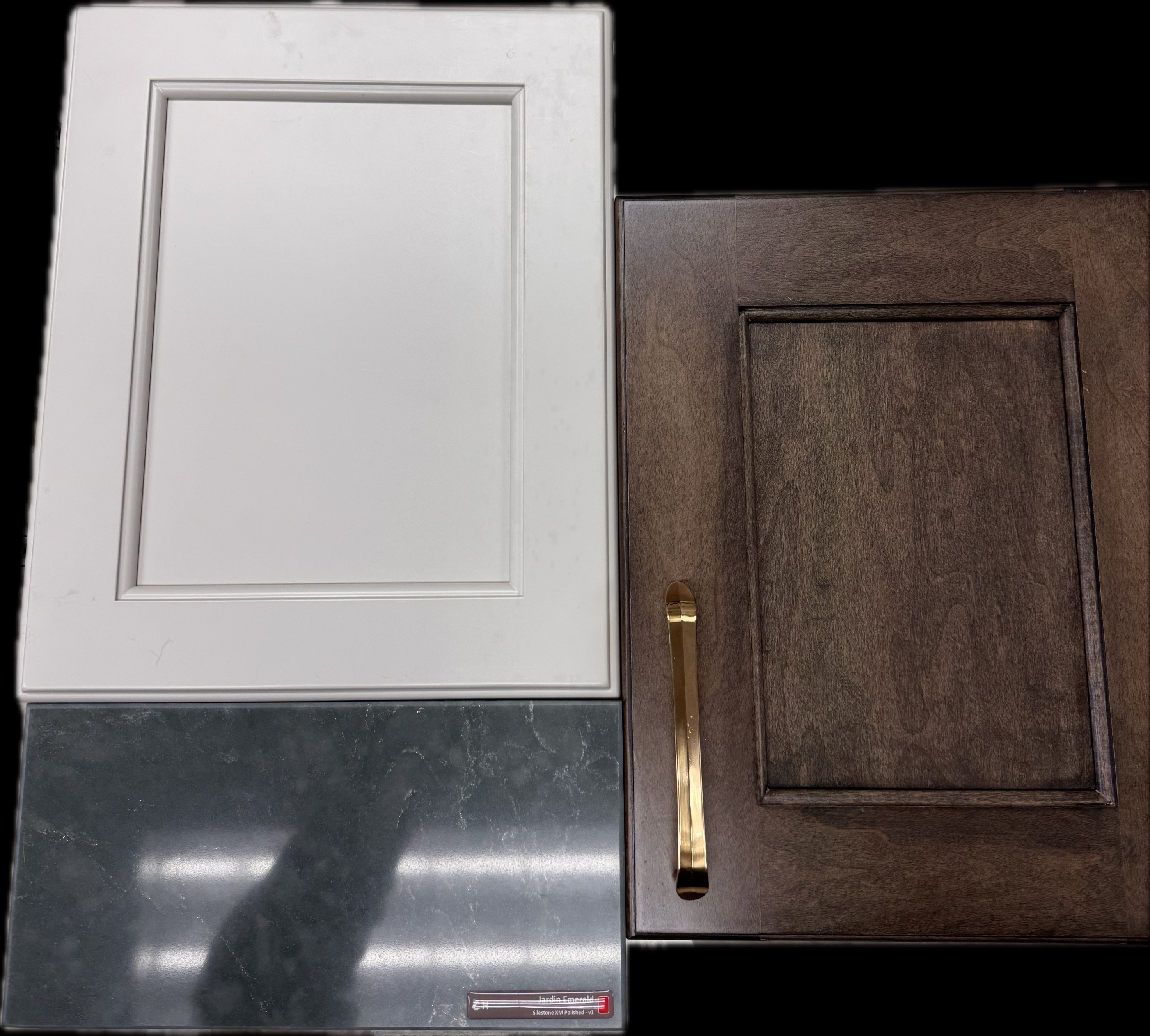l shale kitchen the upper cabinetry to be in revere pewter by benjamin moore base cabinetry and tall pantry cabinetry to be in maple stained larchwood countertop to be jardin emerald by silestone hardware to be the exact one in the image please do not add a fridge the only appliance to add is a cook top make the range hood a waterfall hood in mapped stained larchwood