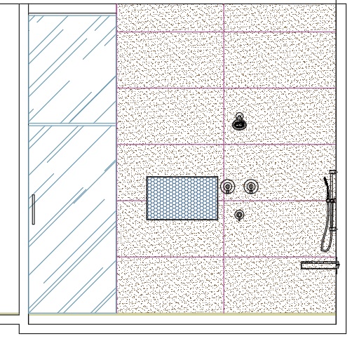 render this shower area realistically stay true with the scale in the layout using 48 x 24 lightstone traverten for the niche as shown using mother or pearl fan mosaic use stainless steel schluter on all sides of niches and the edge of tiles on the right there is floating shower bench