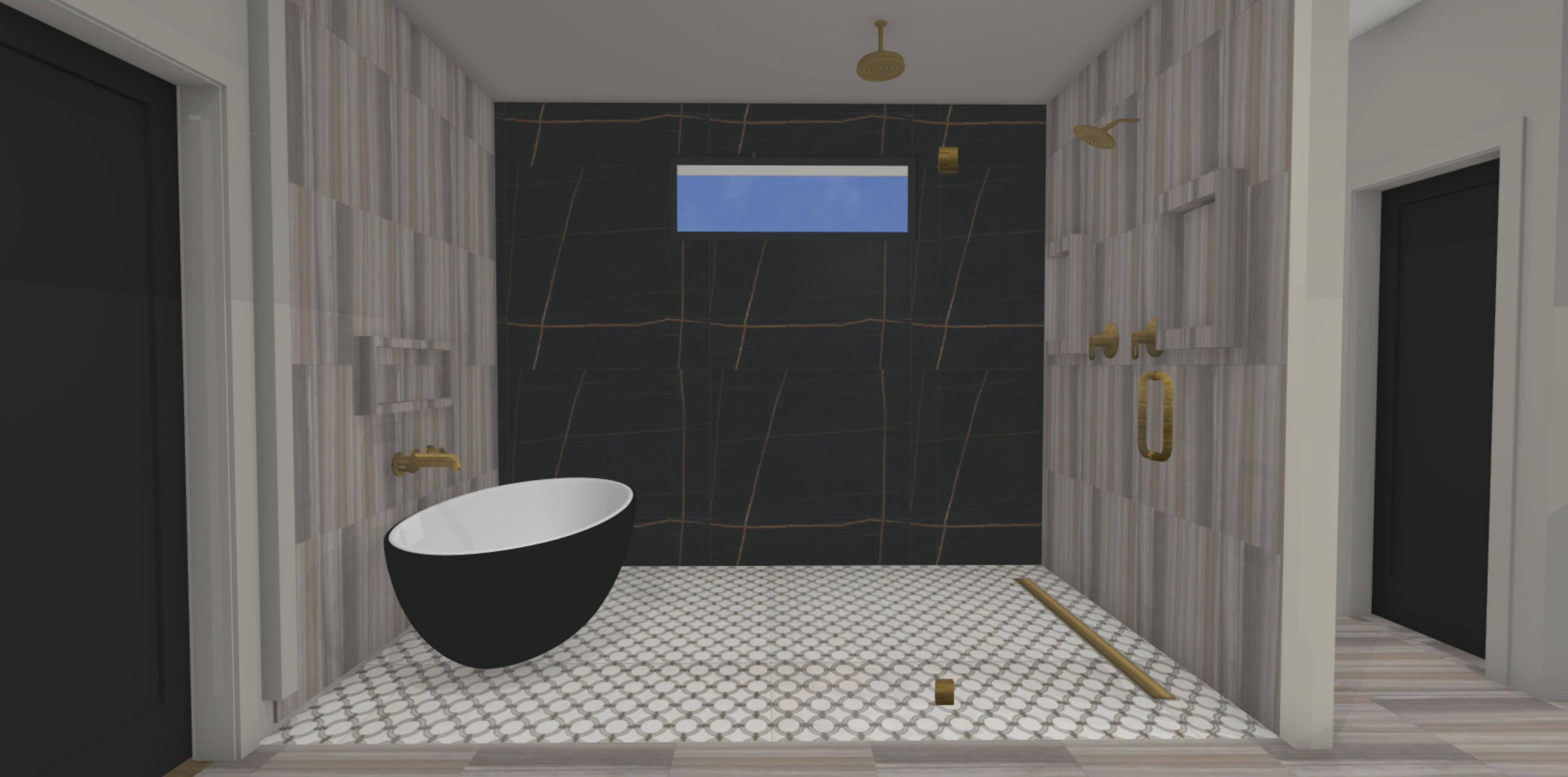 create photorealistic rendering note one niche on left wall and two niches on right wall