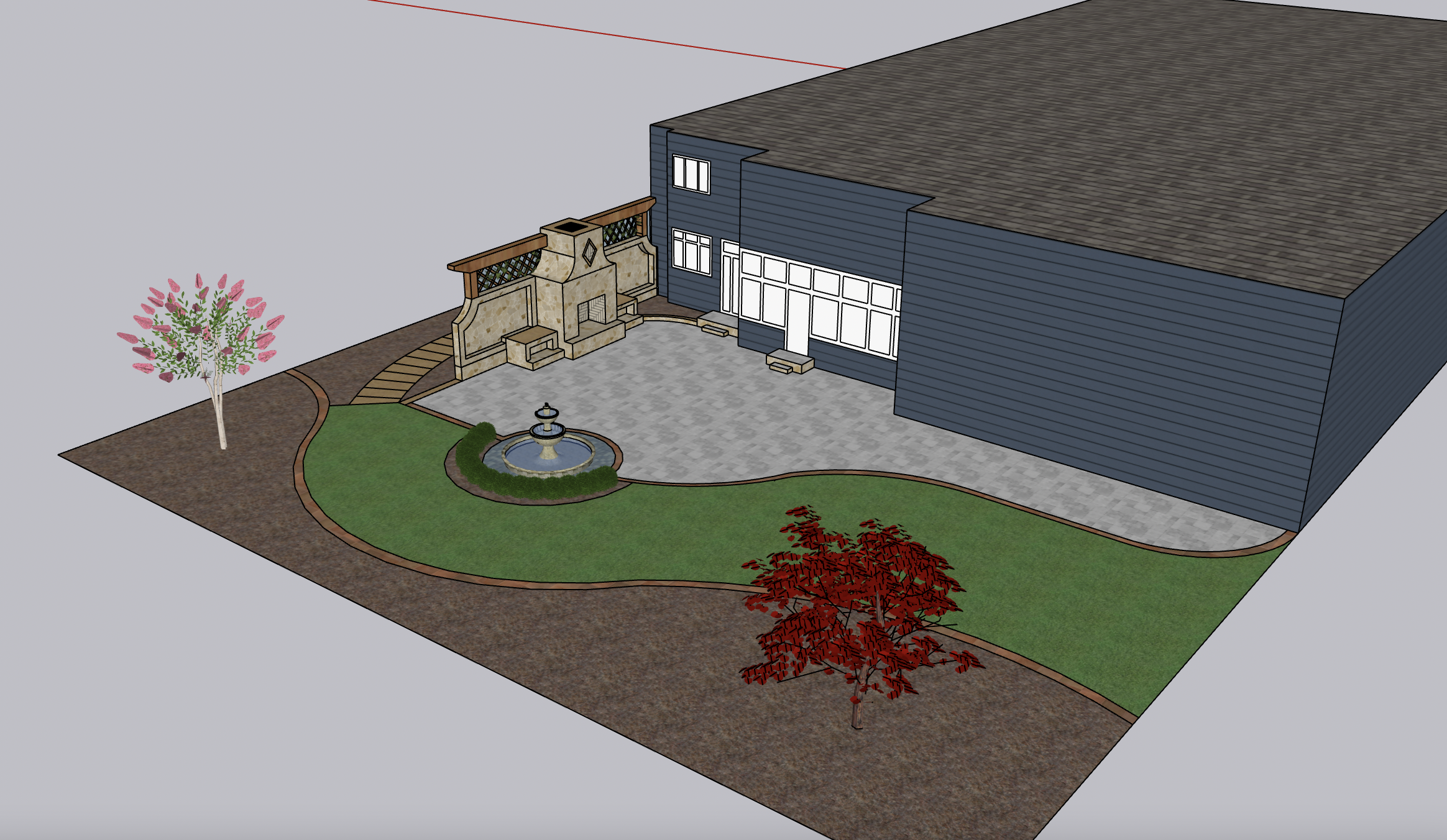 the patio should be bluestone natural pavers with cream mortar and the stone for the fireplace and the copper border edging is the same style as what i have presented and make the fireplace smaller