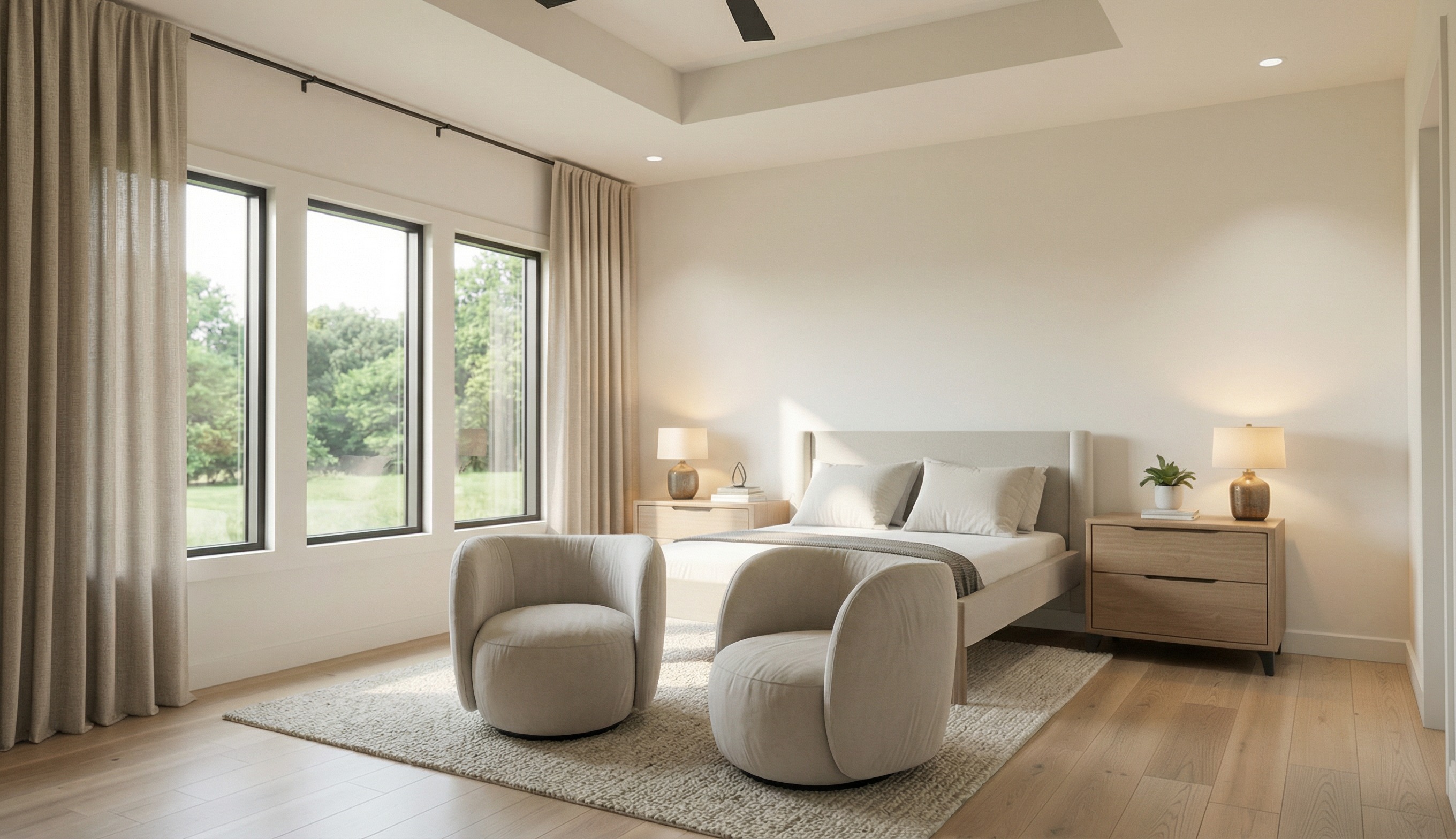 enhance this image to make the bed comforter and pillows appear full soft and highly realistic while maintaining the exact architecture layout furniture placement and materials shown in the original rendering do not change or move any furniture walls lighting or design elements only refine the bedding appearance the bed should feature a full plush comforter with natural volume and soft folds layered pillows that appear full structured and realistically arranged bedding that feels luxurious soft and inviting similar to high end hotel or restoration hardware styling the color palette should be neutral and calming including whites warm beiges soft cream tones fabrics should appear natural and high quality with subtle texture such as cotton or linen avoid flat or overly smooth surfaces the bedding should show realistic creasing drape and depth lighting should remain soft and natural allowing highlights and shadows to enhance the texture and volume of the bedding the final image should appear highly photorealistic warm and inviting with bedding that looks naturally styled and professionally photographed do not alter any other elements in the image only enhance the bedding realism and styling