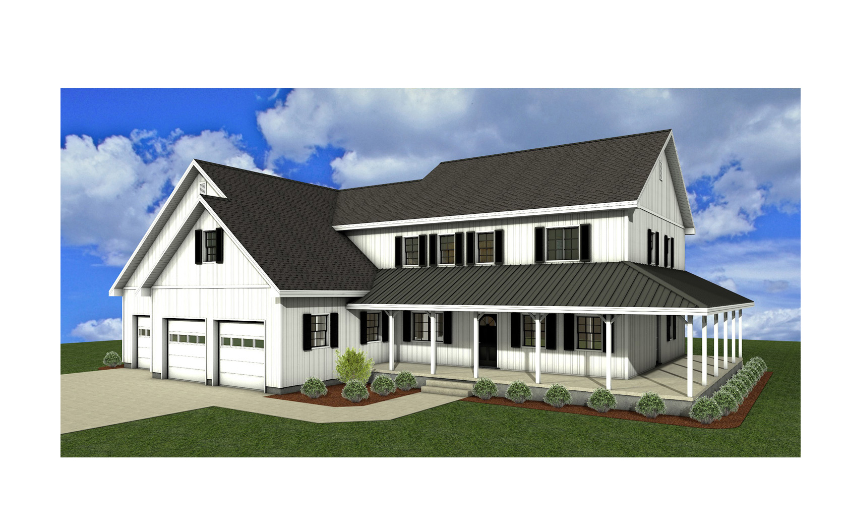 a modern house retain the exact structure colors and window arrangement rooflines siding foundation height and proportions exactly as shown in the reference image integrate into the terrain there is a lush dense forest of mixed hardwoods that are mostly on the sides of the image add cooler afternoon sunlight subtle dappled highlights across the siding and grass create ultra realistic lighting crisp shadows detailed textures in the siding and glass reflections and an overcast sky show only a few lights visible inside render in hyper realistic architectural visualization quality 8k resolution add a driveway tying into the concrete garage door apron make it the fall season add realistic landscape