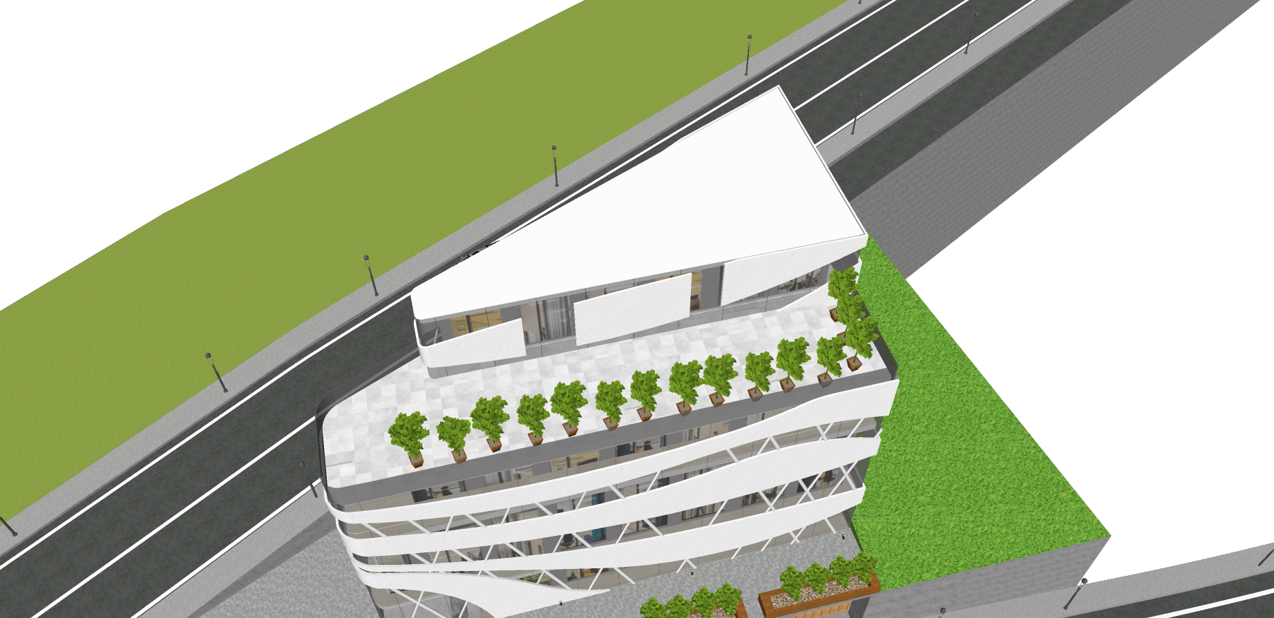 photo of a modern mixed use building with a sleek and dynamic design emphasize the white textured fa ade lush greenery on the terrace and innovative structural elements set in an urban environment surrounded by a paved road and manicured grass spaces with streetlamps providing soft evening illumination capture the scene from a high angle utilizing a wide angle lens to showcase both the building and its contextual landscape highlighting the interplay of light and shadows across the surfaces