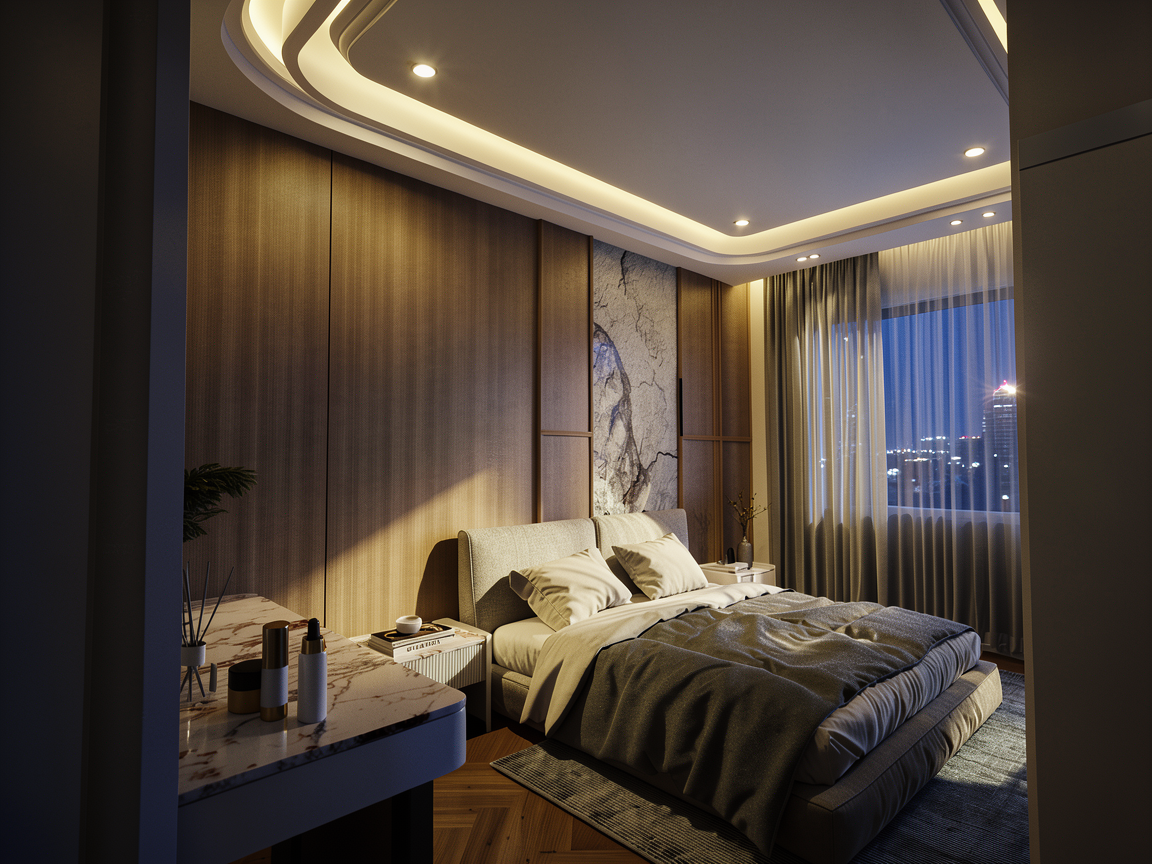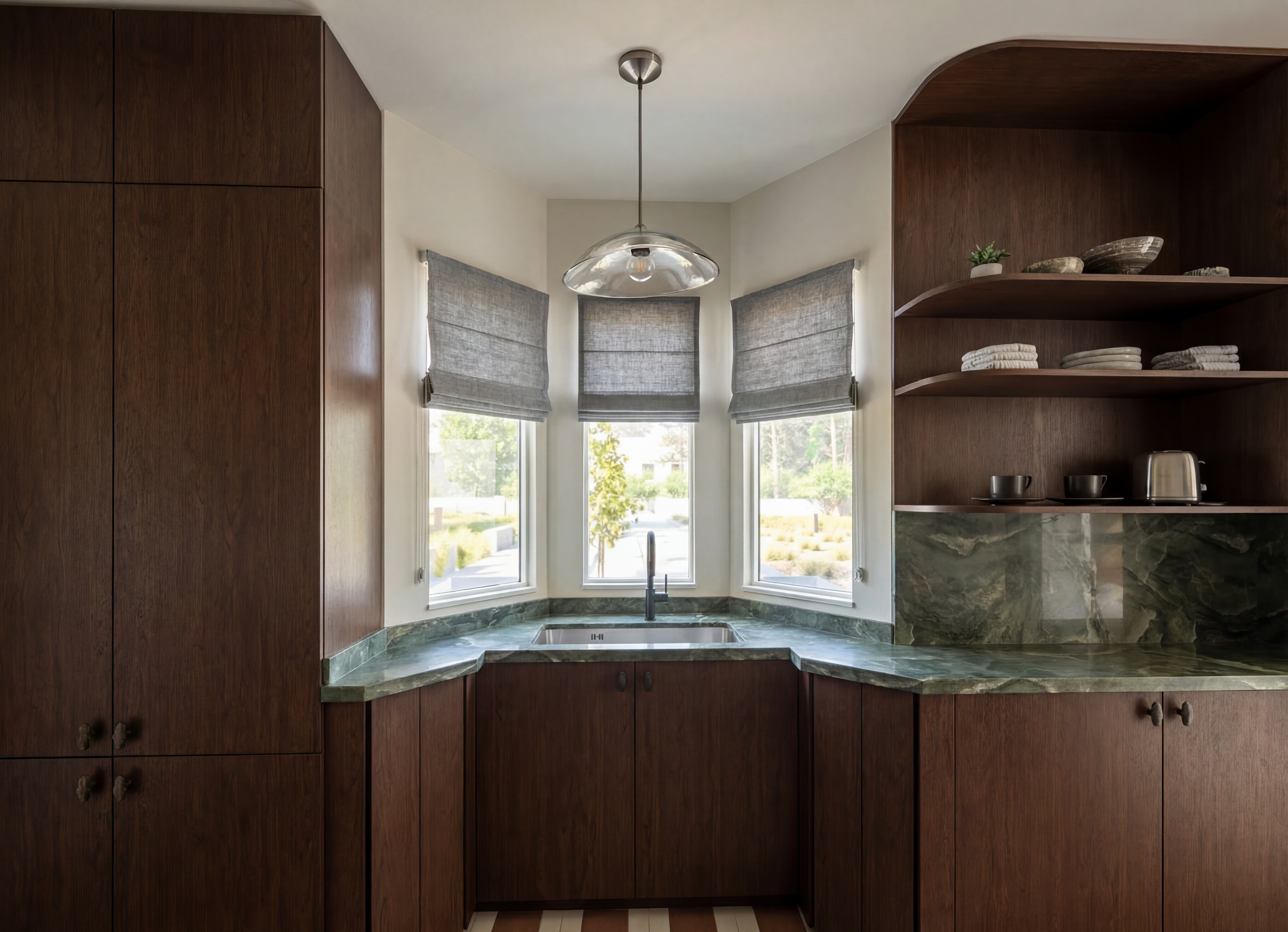 create a photo realistic rendering of a modern kitchen use deep walnut wood tones for the cabinets and island giving a rich luxurious feel the backsplash and range hood are adorned with a marble pattern in shades of brown and beige adding elegance incorporate matte black handles and fixtures for a sleek contrast the wall sconces should be in brushed brass for warmth and sophistication the flooring is a dark polished hardwood enhancing the overall depth the atmosphere is cozy yet modern with warm ambient lighting creating an inviting and stylish space make the space lighter all cabinet pulls and knobs will be brass the faucet will be matte black overall lighting warm balanced and slightly brighter than current sconces must cast visible downward light beams onto backsplash add soft under cabinet lighting glow do not overexpose or wash out materials maintain warm high end interior mood both side openings must lead into interior rooms not blank or exterior use warm cohesive tones wood taupe soft browns no bright white or harsh contrast slightly dimmer lighting than kitchen