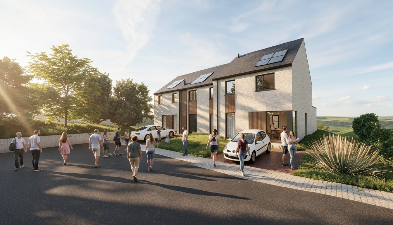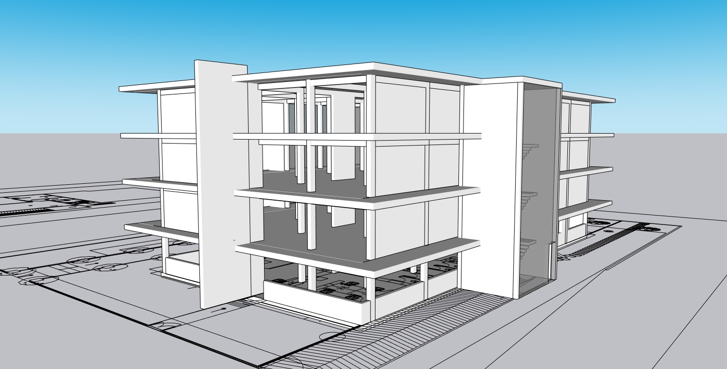 photorealistic architectural render of a modern minimalist white apartment building 3 4 stories flat roof clean cubic volumes continuous external fa ade screen made of thin vertical aluminum louvers wrapping around balconies evenly spaced slats forming a semi transparent brise soleil glass sliding doors recessed behind the screen soft warm golden hour lighting long shadows smooth white plaster walls minimal landscaping contemporary architecture sharp lines high detail realistic materials