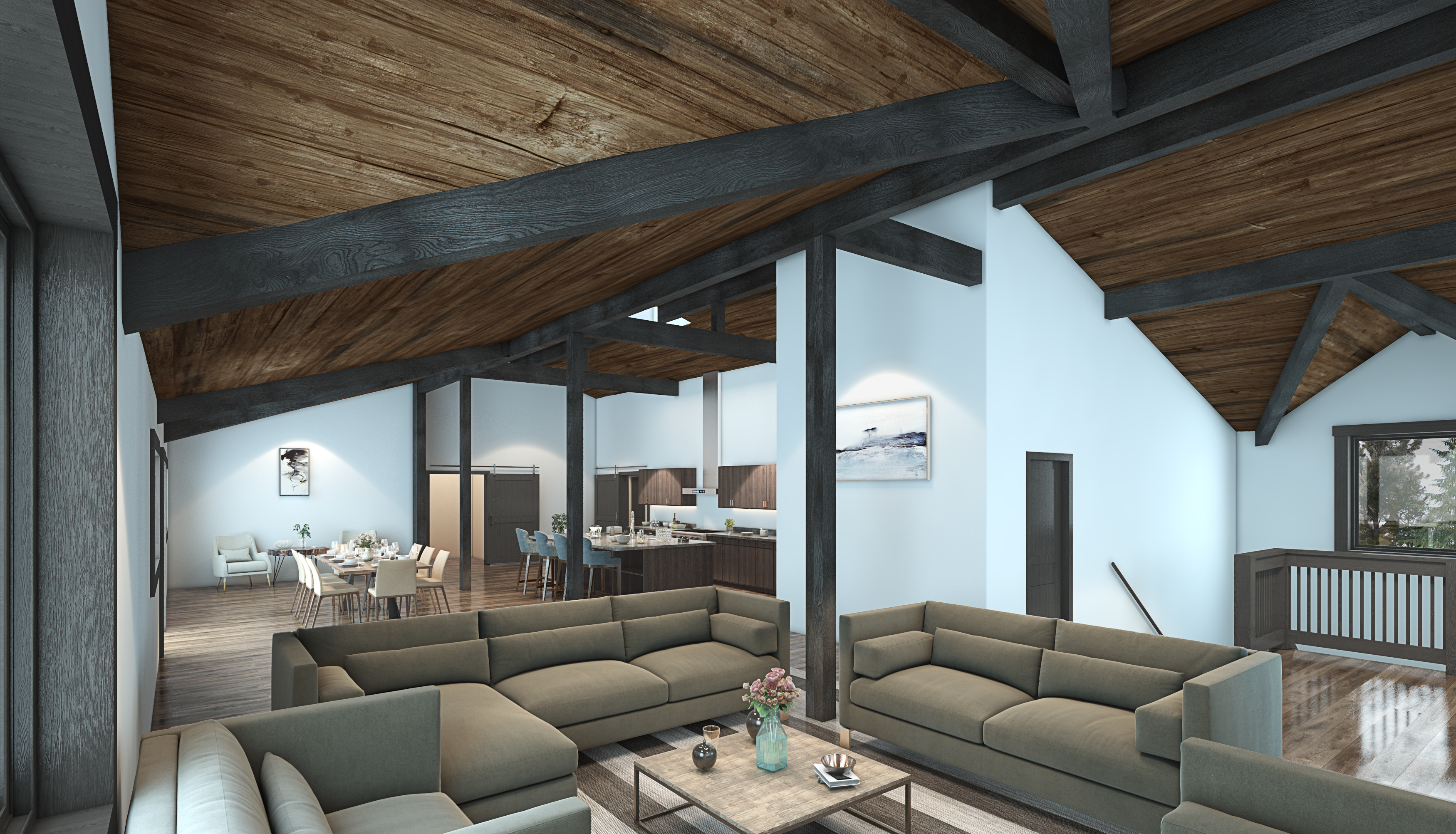 a warm timber interior architectural visualization wide angle living space with natural wood ceilings vertical timber wall panels oak flooring and minimal built in furniture soft daylight filtering through large windows calm and serene atmosphere cinematic interior render soft shadows muted neutral palette scandinavian japandi influence editorial architectural composition calm spatial depth conceptual yet realistic presentation concrete floors