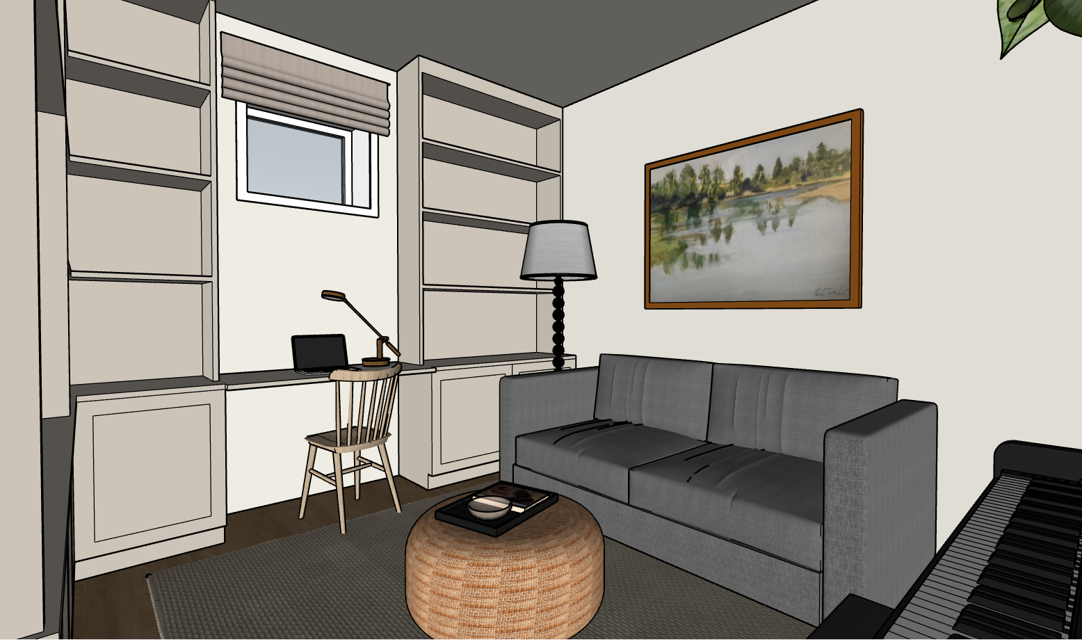 add lots of beautiful neutral books plants little ceramic pots and decor to the shelves cabinetry to be a light beige grey cream colour light from the floor lamp as well as from a skylight not seen in the image