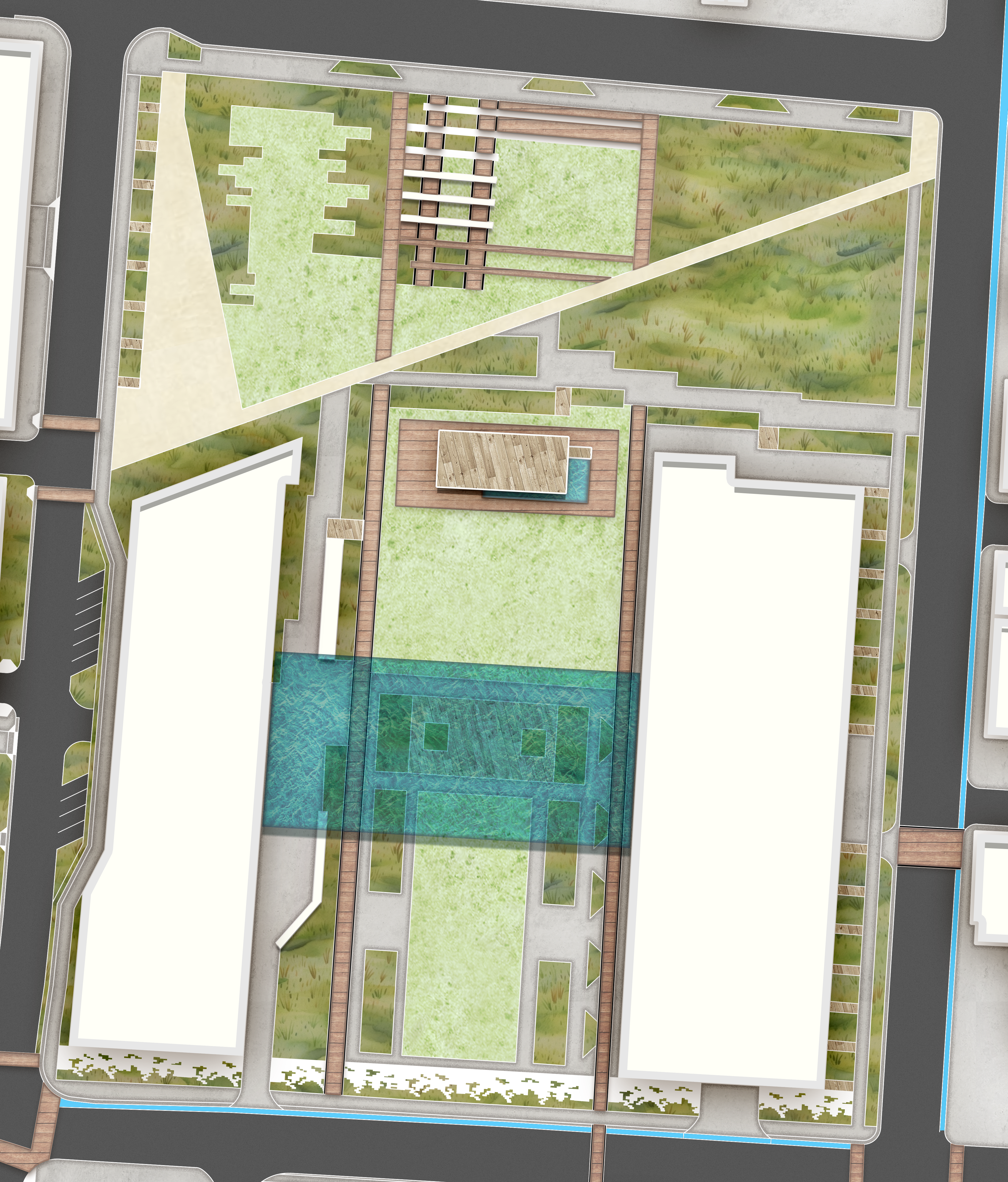 can you add string lights on both buildings planting on both buildings and a pool on one building do the glass bridge connecting the two buildings add cabanas seating a bar and people