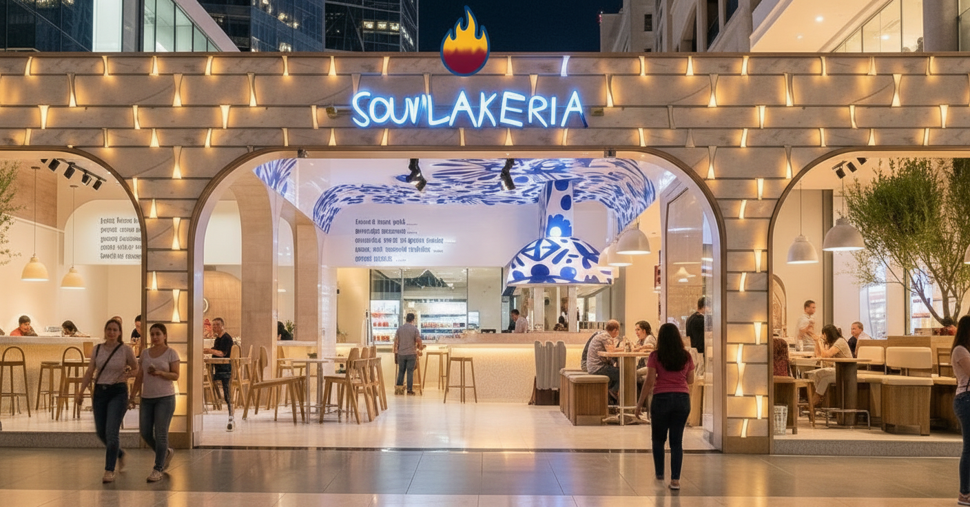 place in a paris down town it next to other food pop up stores along a large commercial and street fooding street on the side of the street along the road or the sidewalk like all the other stores the view should be perspective add more people clients in the store