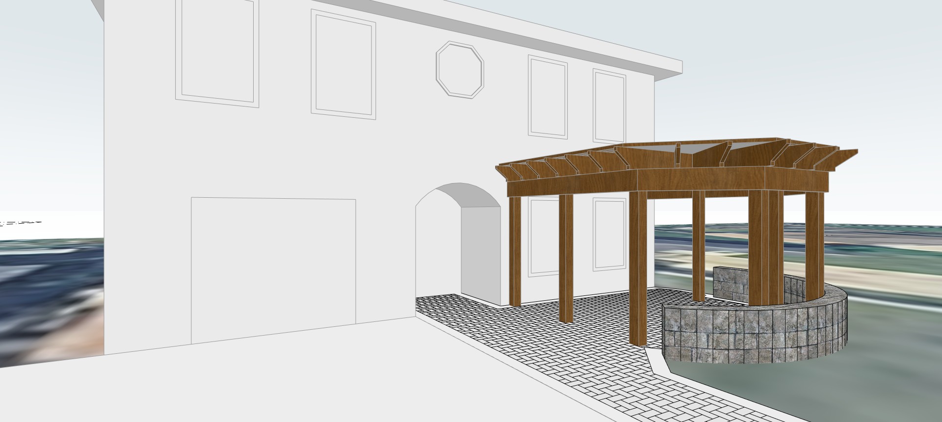 renderizar esta imagen de una pergola de madera sobre una superficie de brick pavers tambien tiene un muro bajo de piedra stacked stone la ubicacion del proyecto es harlingen tx