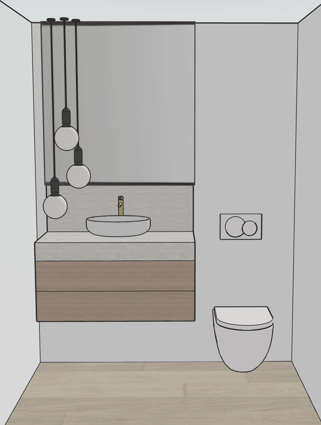 modern powder room neutral wood plank flooring smooth floating vanity with flat panel cabinetry light oak countertop light grey beige travertine brushed gold faucet modern pendant light