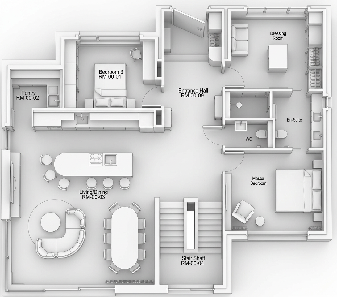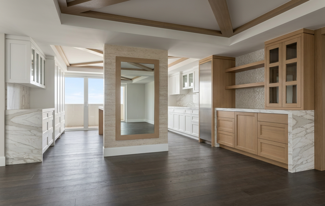 transform the provided elevation into a hyper realistic interior photograph that is indistinguishable from a real professionally shot interior design photograph this must read as a real space captured by a camera not a rendering not a visualization not architectural cg not concept art and not an illustration geometry lock non negotiable preserve the exact original geometry layout proportions ceiling details wall depths panel divisions openings doors cabinetry locations millwork dimensions built ins and circulation paths with zero architectural changes nothing may move scale simplify or be reinterpreted geometry must remain absolutely unchanged camera derivation critical derive the camera position height angle and framing strictly from the uploaded elevation eye level interior photography centered or naturally balanced composition 24 35mm interior lens feel no dramatic angles no stylized framing do not reuse or approximate camera framing from any previous image remove all drawing artifacts completely remove all linework cad edges drafting outlines diagrammatic shapes sketch artifacts nothing may appear outlined flat schematic or illustrative the elevation must be visually reinterpreted as a finished real interior photograph material realism rules wood if present smooth solid plank material extremely subtle restrained grain matte or soft satin finish only no graphic patterns no decorative striping no visual noise wood must absorb light gently never glossy or sharp fabric upholstery if present soft compression subtle seams gentle shadowing natural fabric texture no flat color blocks stone slabs if present light natural veining soft organic variation low contrast no symmetry no bold or busy patterns stone must feel heavy and grounded walls fine surface texture slight tonal variation never flat paint edge construction realism all edges corners joints and transitions must be softly broken and physically realistic no razor sharp corners no cgi perfect edges slight construction tolerances only everything must read as fabricated installed and dimensional lighting photographic behavior lighting must behave like real high end interior photography natural daylight only unless otherwise specified realistic light bounce gentle shadow falloff uneven exposure distribution subtle brightness variation across surfaces avoid studio lighting uniform illumination over clean exposure global illumination look slight softness is preferred over sharpness camera image imperfections very important introduce subtle photographic characteristics gentle lens softness micro exposure variation natural contrast roll off mild atmospheric depth primary plane sharp background slightly softer the image must feel captured not generated absolute constraints no creative interpretation no stylization no exaggeration no added or removed elements any deviation from the original elevation geometry or intent is unacceptable negative prompt always include architectural rendering 3d visualization cgi unreal engine octane vray sketchup look flat textures graphic lines outlined edges over sharpened studio lighting concept art illustration ai look plastic materials glossy wood high contrast grain perfect symmetry keep both ceilings as they shown in pictures ceiling in the back of the picture has no cross in it