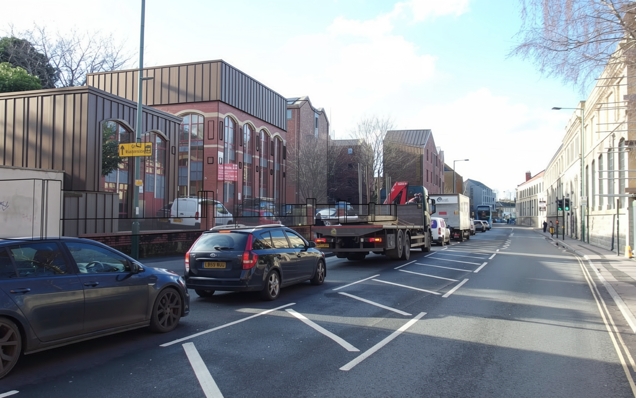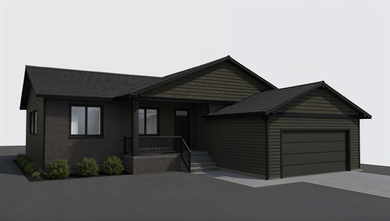 create a photo realistic rendering of this kitchen removing the dimension lines numbers and labels use lainecraft dark forest brown cabinets silver cabinet pulls whirlpool stainless steel appliances white quartz with light gray veining and light natural wood laminate flooring with hints of gray tones add daltile remedy zen 2x10 glossy tile backsplash that meets the bottom of rangehood