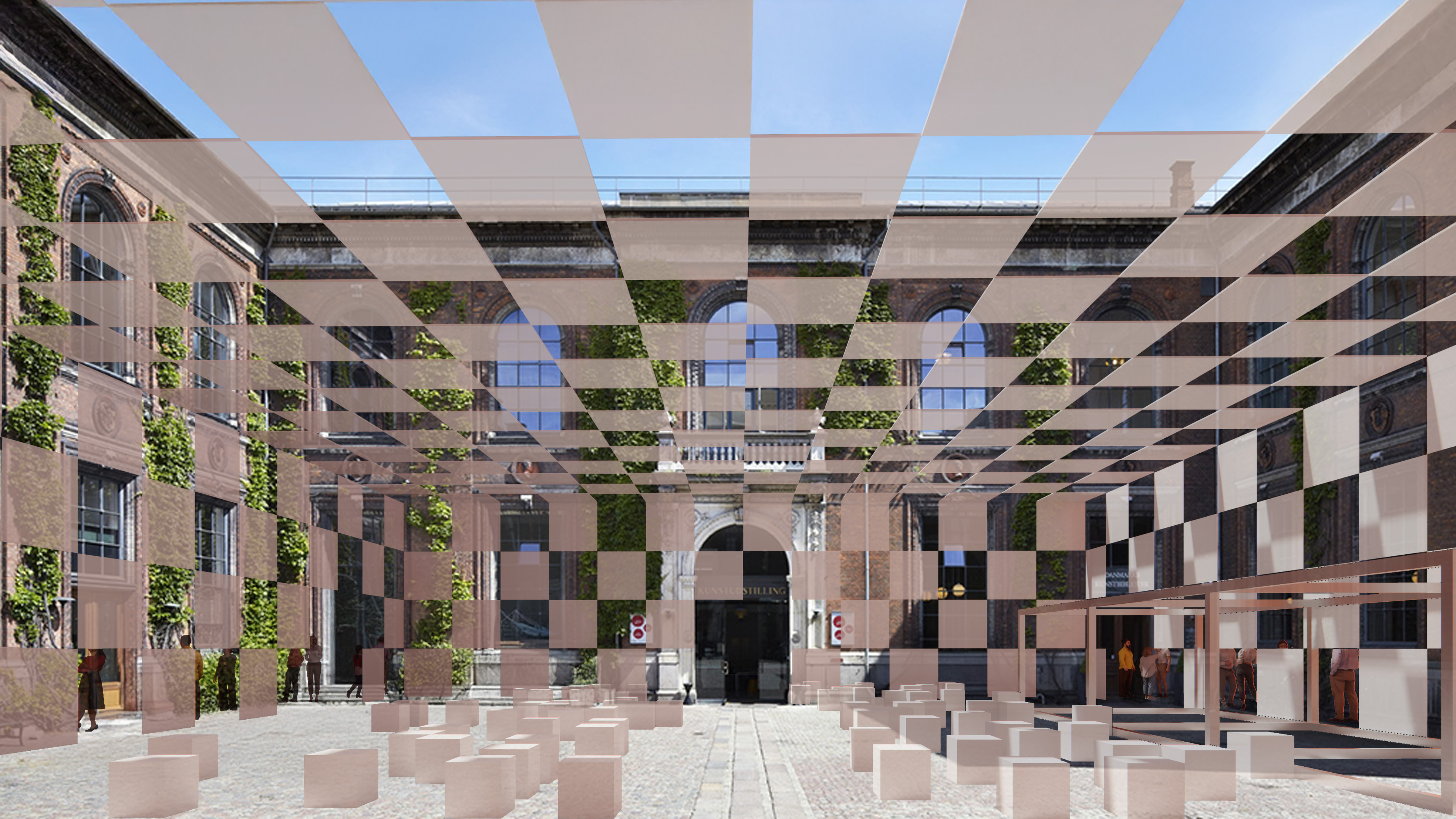 installation in the courtyard of istorical building the installation consists of squared thick fluted blurry polycarbonate pieces arranged in a pattern that covers and uncovers the building and tied together with steel ropes make each white square a thick fluted blurry polycarbonate sheet make each white box a fluted blurry polycarbonated seated cube with people seating add hundreds of people enjoying the installation behind the installation also some simple stainless steel bar structures make a beautiful realistic immersive and dramatic render in the style of a mir render