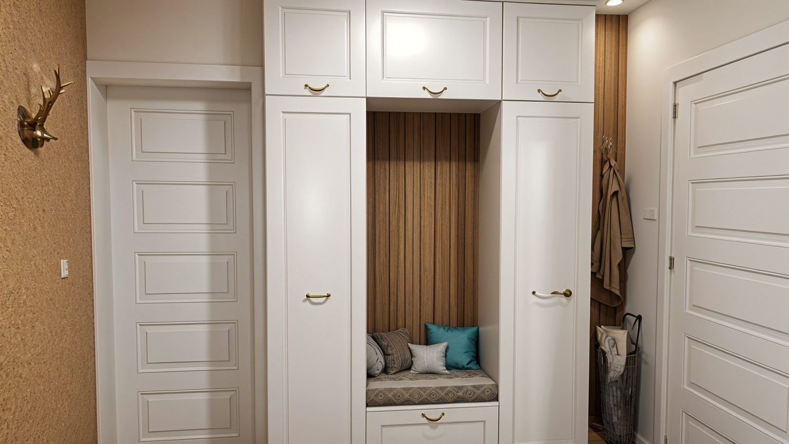 photorealistic interior render of a serene scandinavian bedroom features a low profile natural ash wood bed frame without a headboard dressed in crisp white linen and a plush beige throw flanking the bed are two minimalist light oak nightstands with tapered legs the standout feature is two slender black pendant lights hanging from the ceiling directly over each nightstand casting a warm soft glow soft natural daylight the color palette consists of warm whites soft greiges and light oak wood background features a large framed black and white minimalist architectural print above the bed 8k resolution architectural visualization style soft shadows tranquil atmosphere