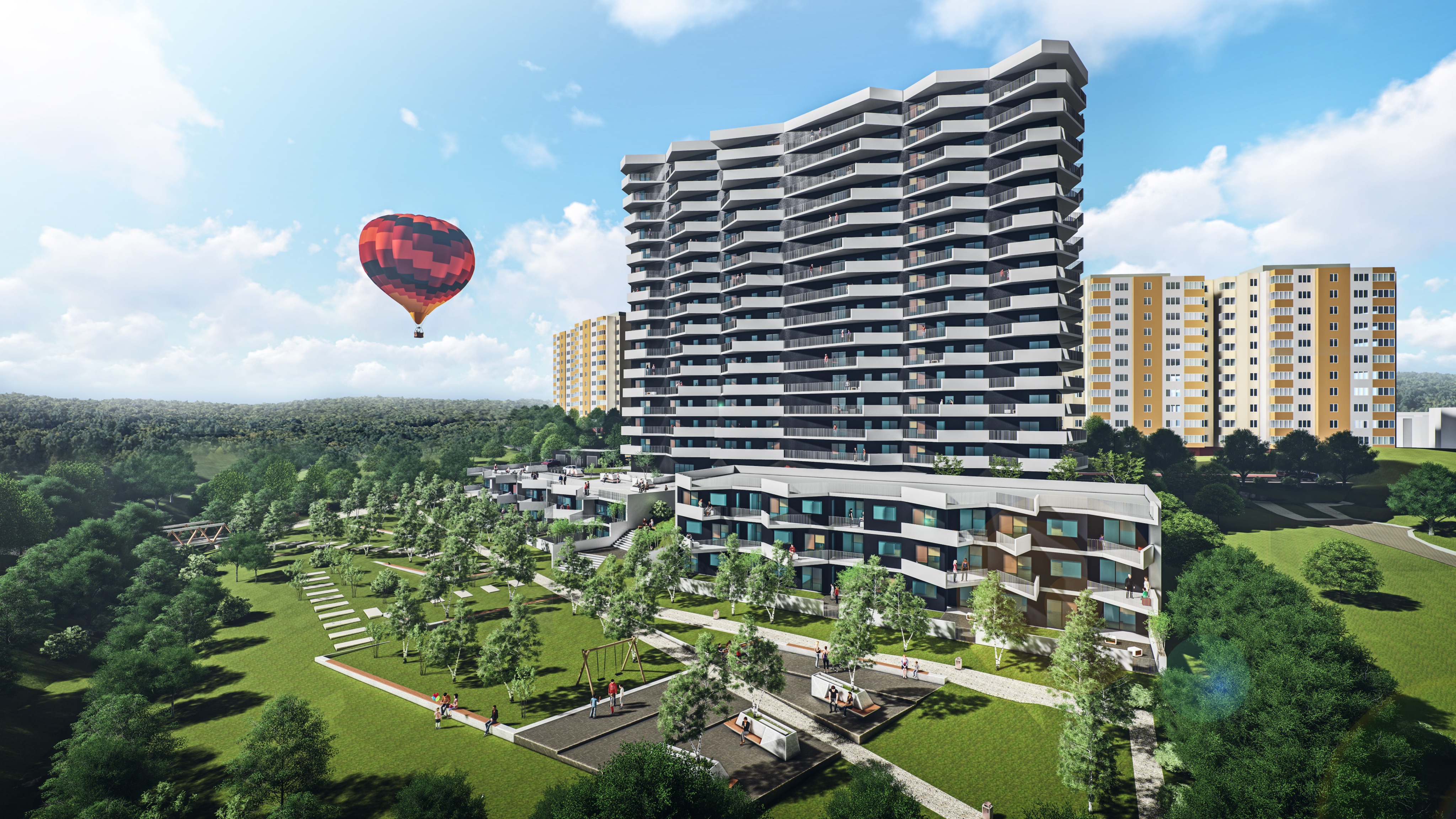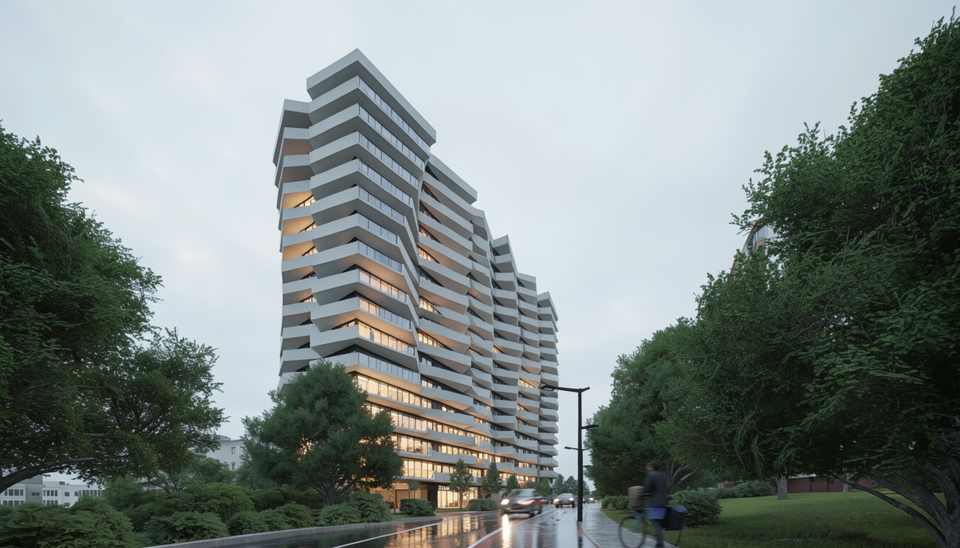 important preserve the existing geometry and the existing context exactly as provided do not modify alter reinterpret add remove scale or reshape any geometry do not change the site surroundings street layout neighboring buildings vegetation or context elements do not modify geometry scale proportions buildings road layout sidewalks or surrounding context in any way do not change text photorealistic architectural rendering clean and balanced contrast calm cinematic mood style contemporary european residential architecture minimalist premium understated soft overcast noon atmosphere diffused natural daylight with subtle blue grey tones cinematic architectural mood large glass surfaces with realistic reflections soft mirror effect subtle environmental reflections of sky and surroundings wet pavement with smooth reflective surface soft light bounce and blurred reflections high dynamic range lighting realistic global illumination soft shadows calm and minimalist nordic mood photorealistic architectural visualization balanced exposure no harsh highlights add interior warm light do not modify text do not add a road delete air baloon