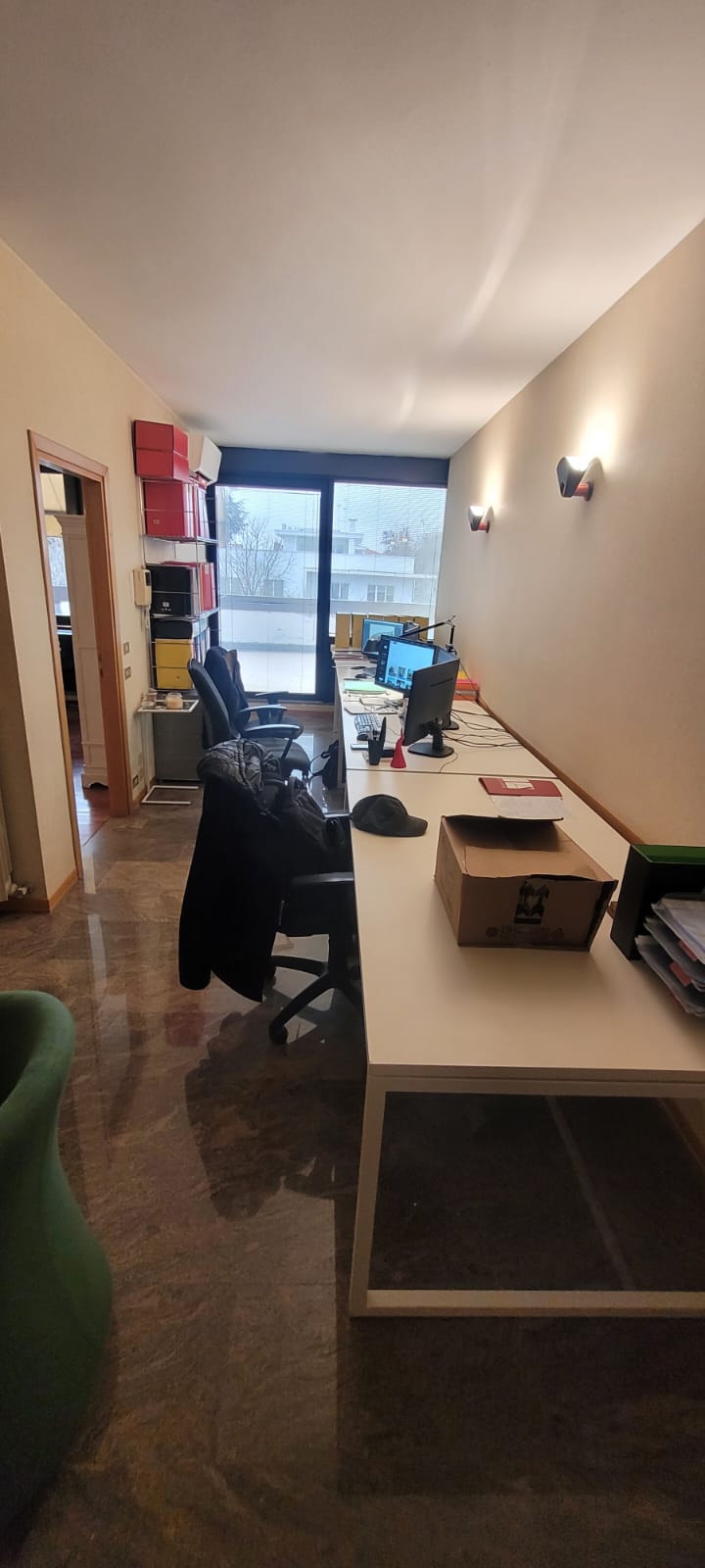 rimuovi tutti gli arredamenti interni presenti e sostituiscili con un arredamento retr chabby chic per ufficio di architettura
