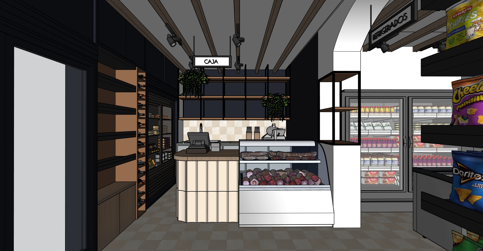 crea una imagen fotorealista a partir de esta de sketchup la luz natural entra desde la puerta de la izquierda da la calle y es un comercio