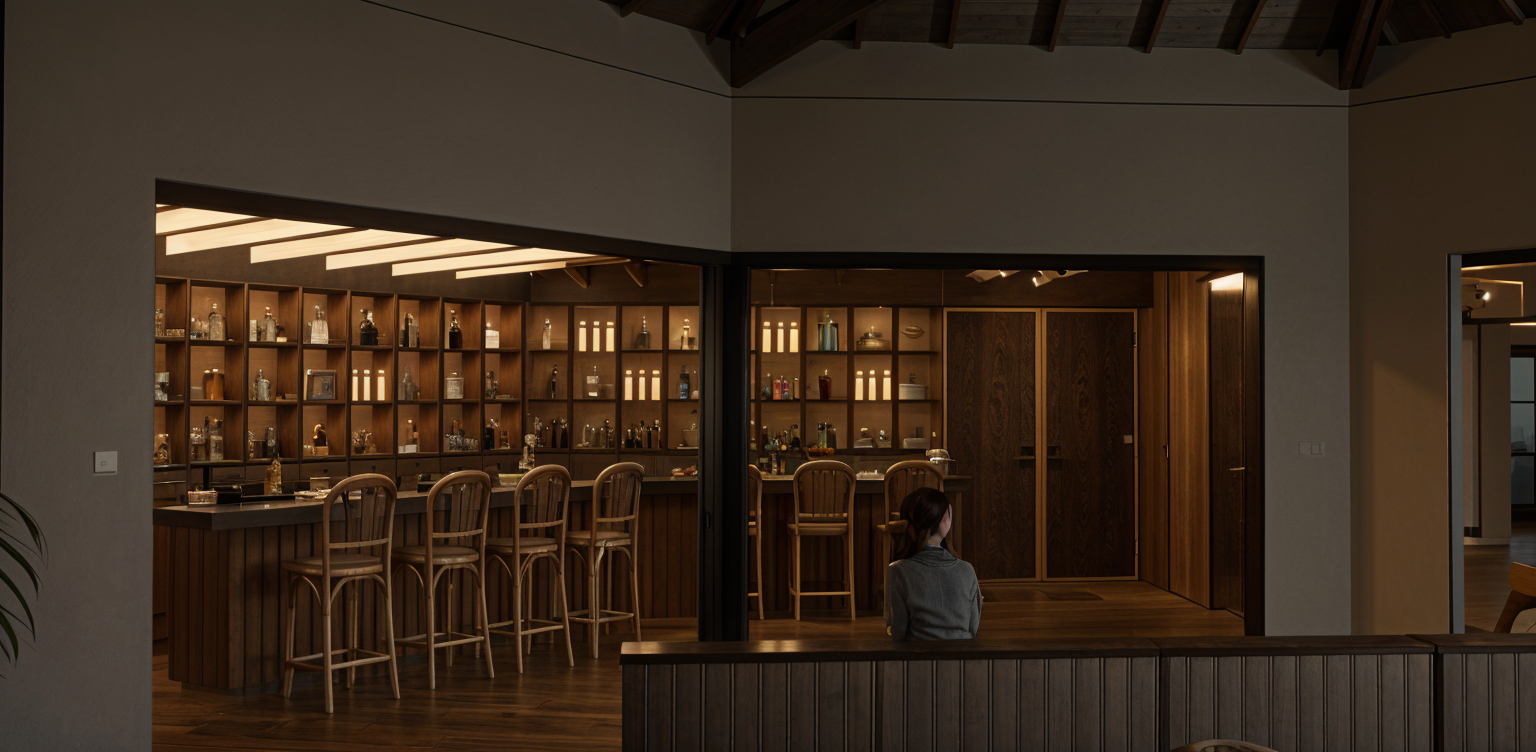 modern farmhouse two story house front elevation with both only 2 garages at 45 degrees to house upper floor comes forward over garage roof slate gray walls white with dark wood trim windows large with black frames deck wrap around door dark oak garage matching walls landscape xeroscape sky clear blue with soft morning sunlight overall atmosphere inviting cozy harmonious blend of modern architecture and nature