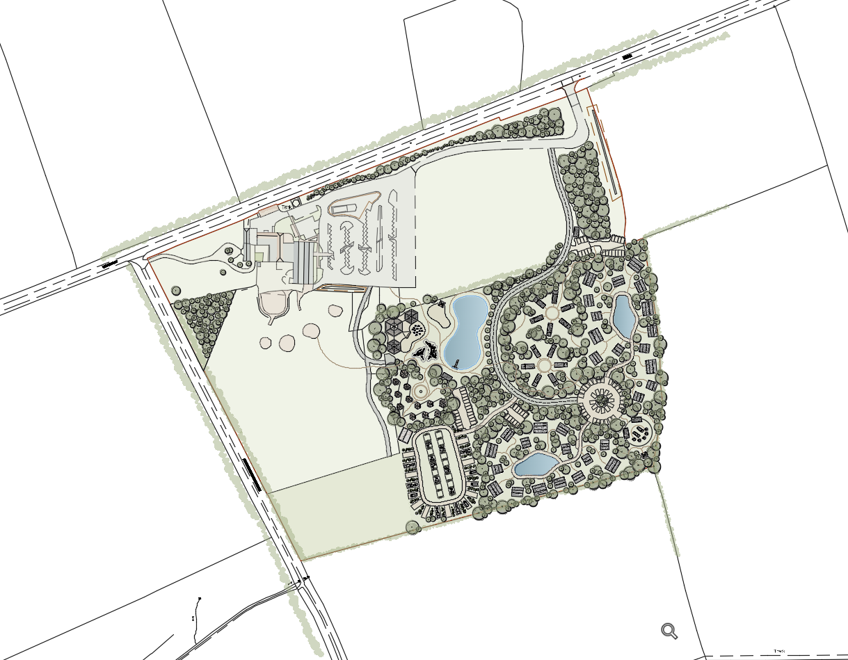 create a detailed landscape rendering of a property map with rolling green fields dense green forests winding pathways and serene reflective blue ponds highlight the borders with a crisp red line for clarity capture the essence of a warm sunny day with soft natural lighting to enhance the vibrant green hues and the gentle blues add subtle textures to the fields and trees for a lush appearance and use a light neutral backdrop to enhance the focus on the property details ensure a sense of peace and tranquility throughout the scene