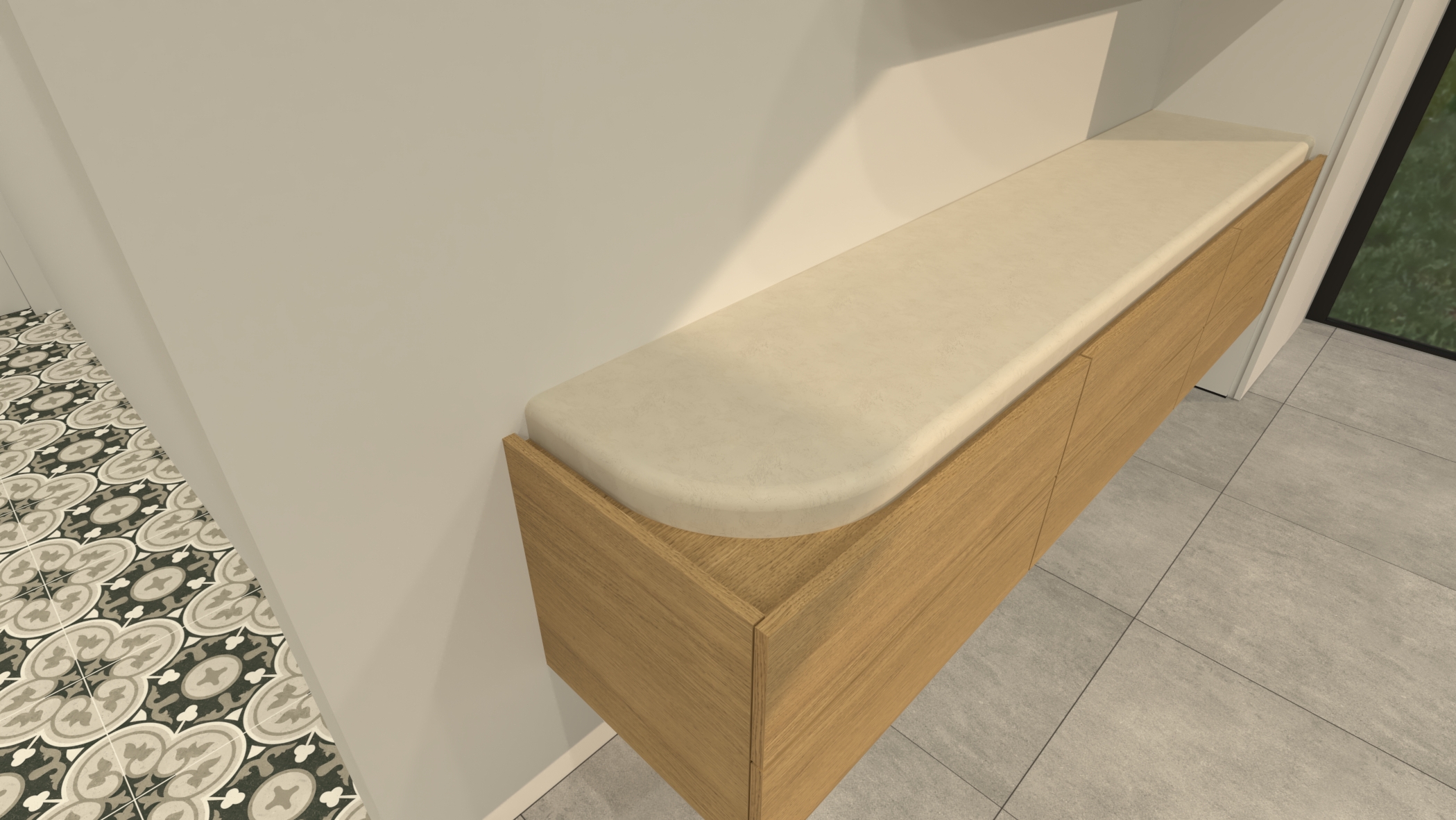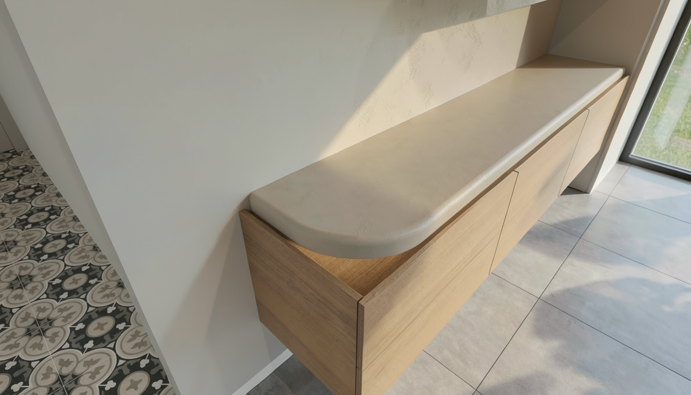 i want a photorealistic image of this render nothing may be changed about the content the floor is a gray tiled floor the shelve are finished in a beige stucco technique under the beige stucco countertop there is a wooden base made from the same wood as the fronts the beige countertop and the wooden surface underneath are attached directly to each other so there is no lighting under the countertop