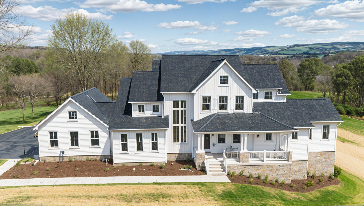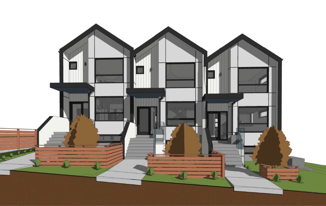 modernist exterior shot a black and white modern scandinavian style triplex situated in the lush area of seattle black trims fascias windows white fibre cement panel and siding cladding wood front entry door wood soffits wood fence clear day with some clouds landscaped with a tree and some grasses in front of each unit someone walking up the hill with a dog looking at the houses a car parked up front by the sidewalk architecture