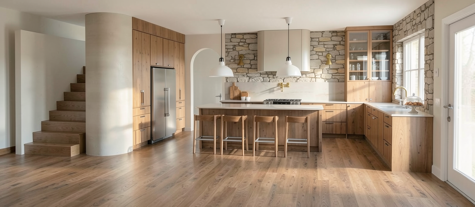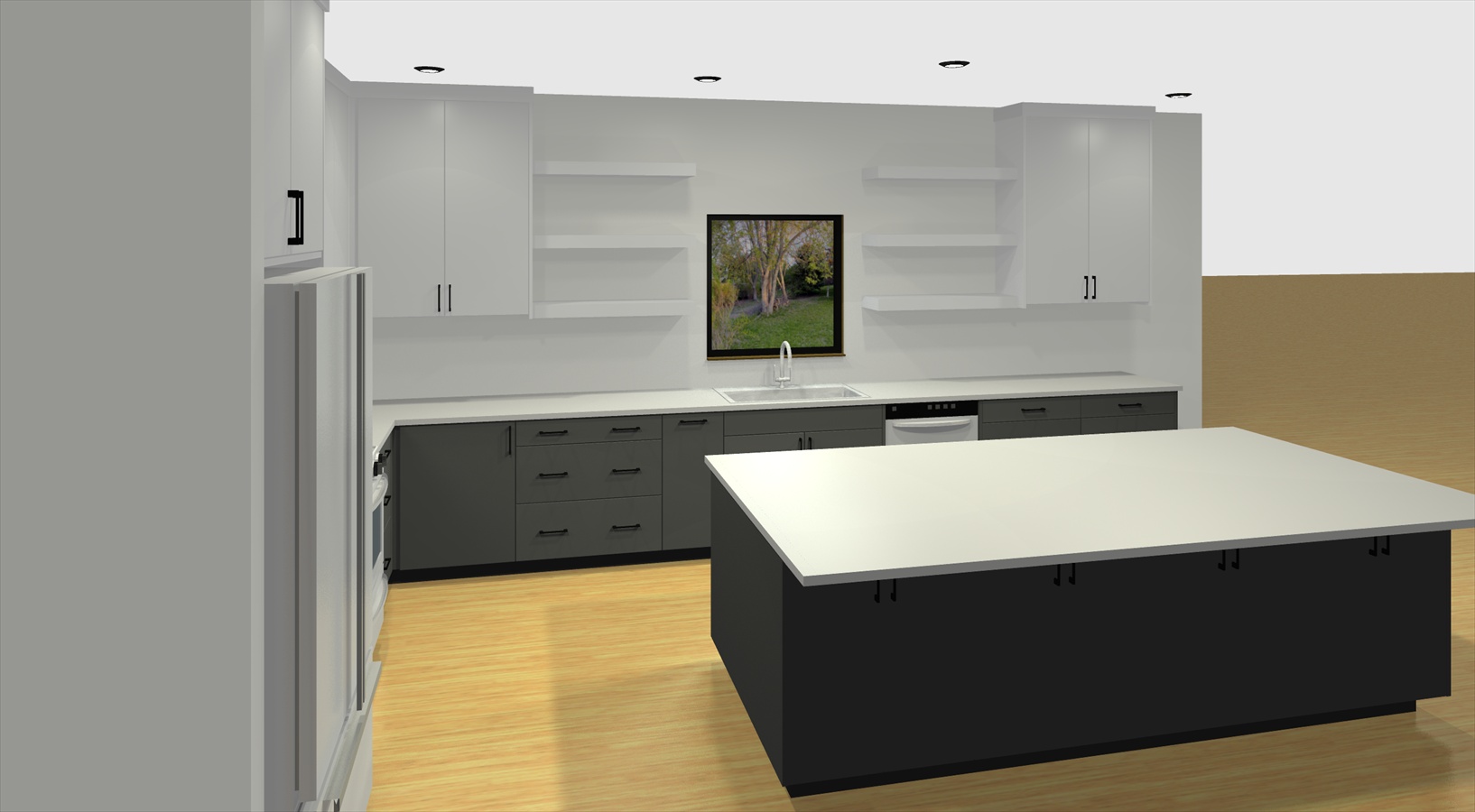 render a modern elegant kitchen interior the upper cabinets and walls should be a crisp white complemented by charcoal black lower cabinets and island include black handles on all cabinets the countertops are a sleek smooth concrete creating a clean and minimal look install warm soft lighting to create a cozy atmosphere casting gentle shadows that enhance the depth the floor is a light finished concrete adding warmth and contrast a window with a black frame provides a view of open countryside adding a touch of nature to the space create an inviting serene atmosphere with a balance of modern design and natural elements