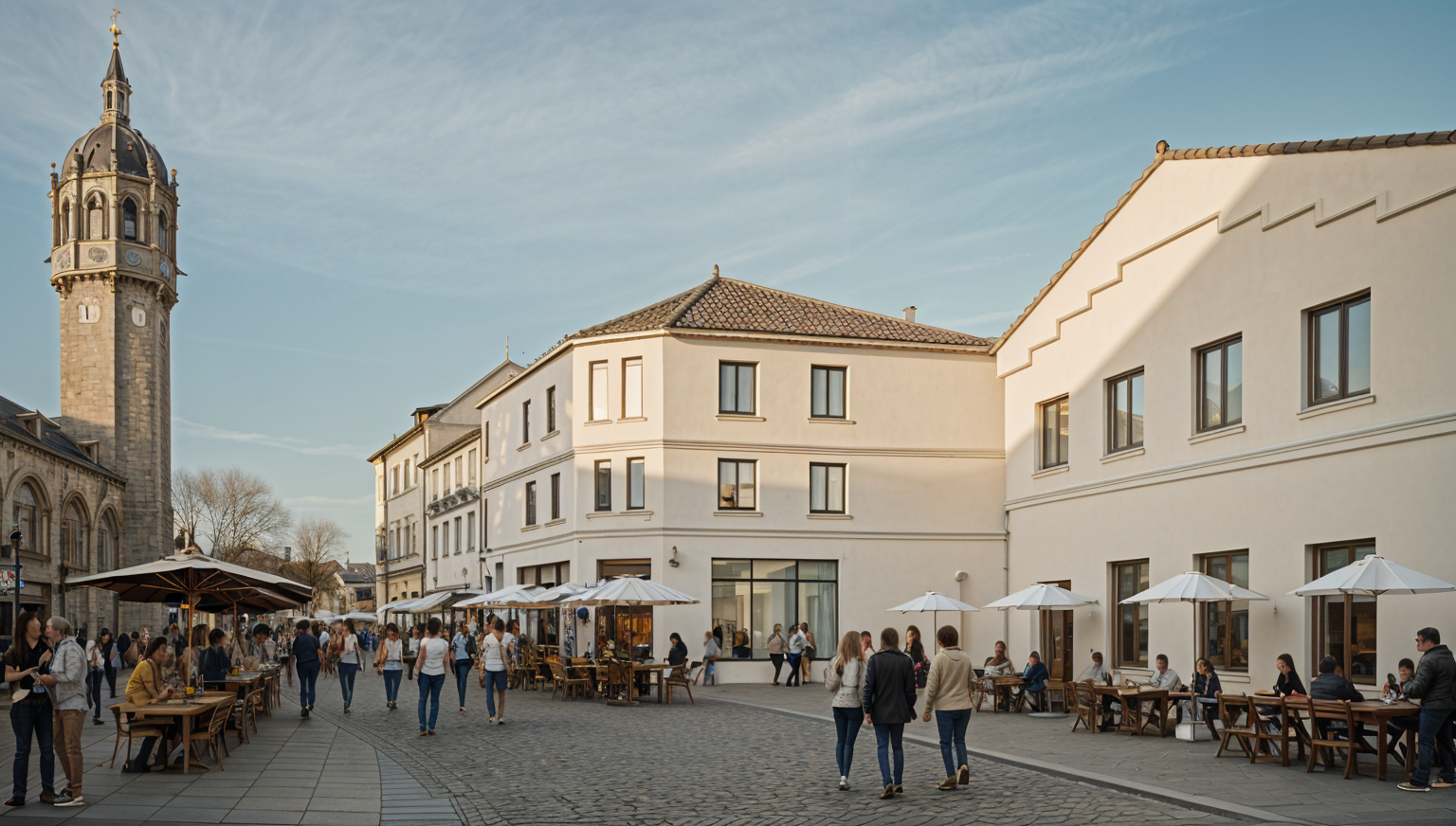 realistische stadtansicht einer historischen altstadt der lutherstadt wittenberg aus leicht erh htem blickwinkel vordergrund belebte stra e mit menschen die spazieren gehen an marktst nden einkaufen und in caf s sitzen stra enszene authentisch und lebendig keine bertriebenen menschenmassen linke h lfte maskiert schlosskirche wittenberg fixieren die linke bildh lfte zeigt die schlosskirche wittenberg exakt wie im originalbild keine nderungen keine k nstlerischen anpassungen keine perspektivverschiebung keine farbkorrekturen die kirche bleibt 100 unver ndert beschreibung der turmspitze der schlosskirche wittenberg turmh he 88 meter markantes wahrzeichen der stadt wittenberg turmhaube neugotisch kupfergedeckt feingliedrige verzierungen turmhelm spitz zulaufend endet in einer schlanken spitze gekr nt von einem goldfarbenen wetterhahn ziel ist die form und silhouette der kirche zu erhalten unterschiede zum originalbild fallen nicht auf keine exakten details keine farben oder ornamente m ssen exakt wiedergegeben werden rechte h lfte fixieren existierende geb ude unver ndert die rechte bildh lfte bleibt exakt wie im originalbild niedrige bis mittelhohe geb ude mit roter dacheindeckung deutsche dachformen historische materialien wie putzfassaden holzfensterrahmen zur ckhaltende moderne akzente dezent stra enszene caf s und menschen bleiben unver ndert keine nderungen oder neugenerierungen