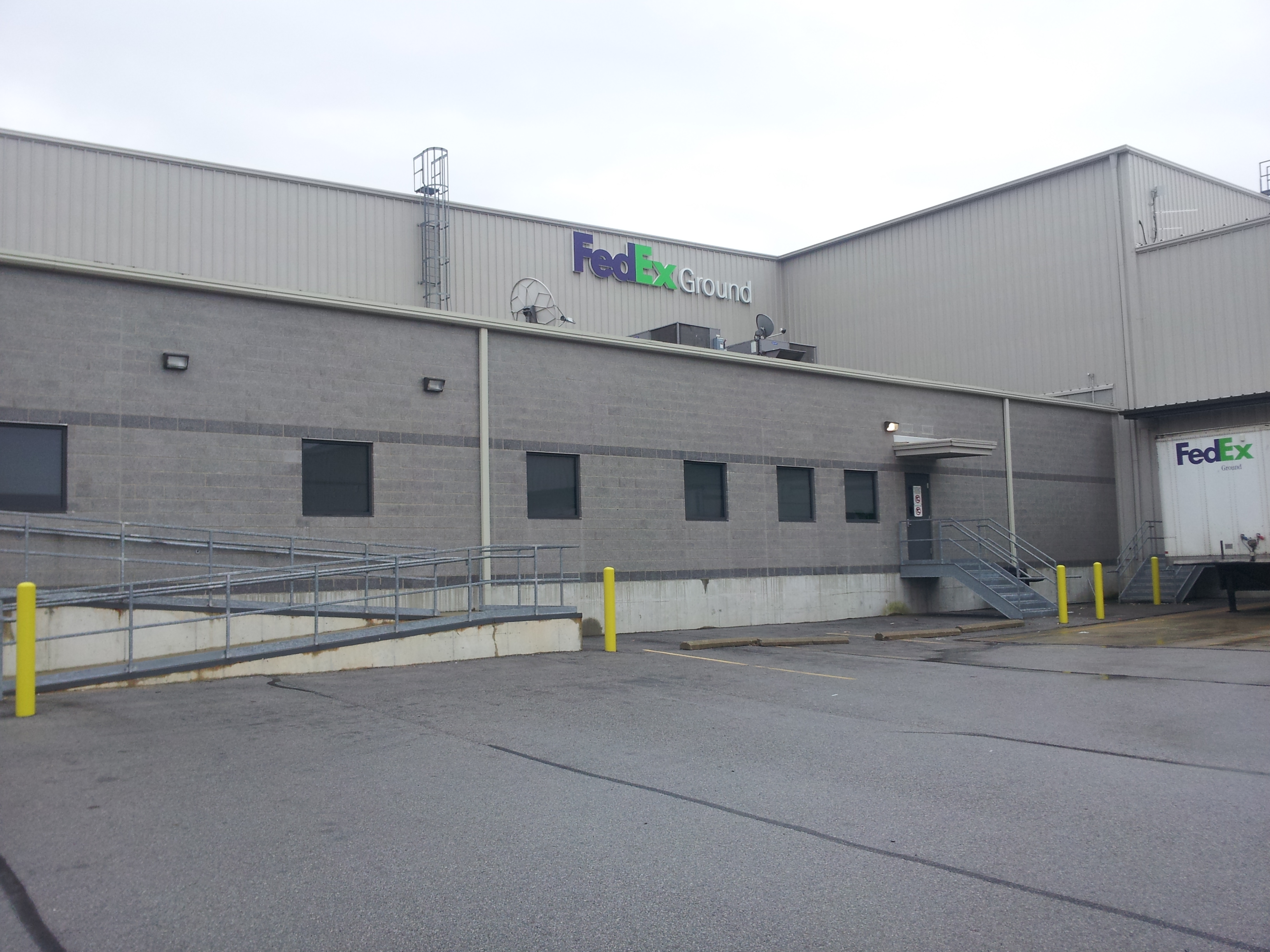 create a vibrant modern rendering of an industrial warehouse scene the building should be sleek and futuristic with a metallic silver exterior add large reflective windows with a subtle blue tint the foreground should feature a smooth charcoal gray asphalt surface illuminate the area with soft ambient lighting for a calm serene atmosphere include yellow safety poles and a gently overcast sky with soft gray tones in the background add realistic shadows and highlights to enhance depth and texture