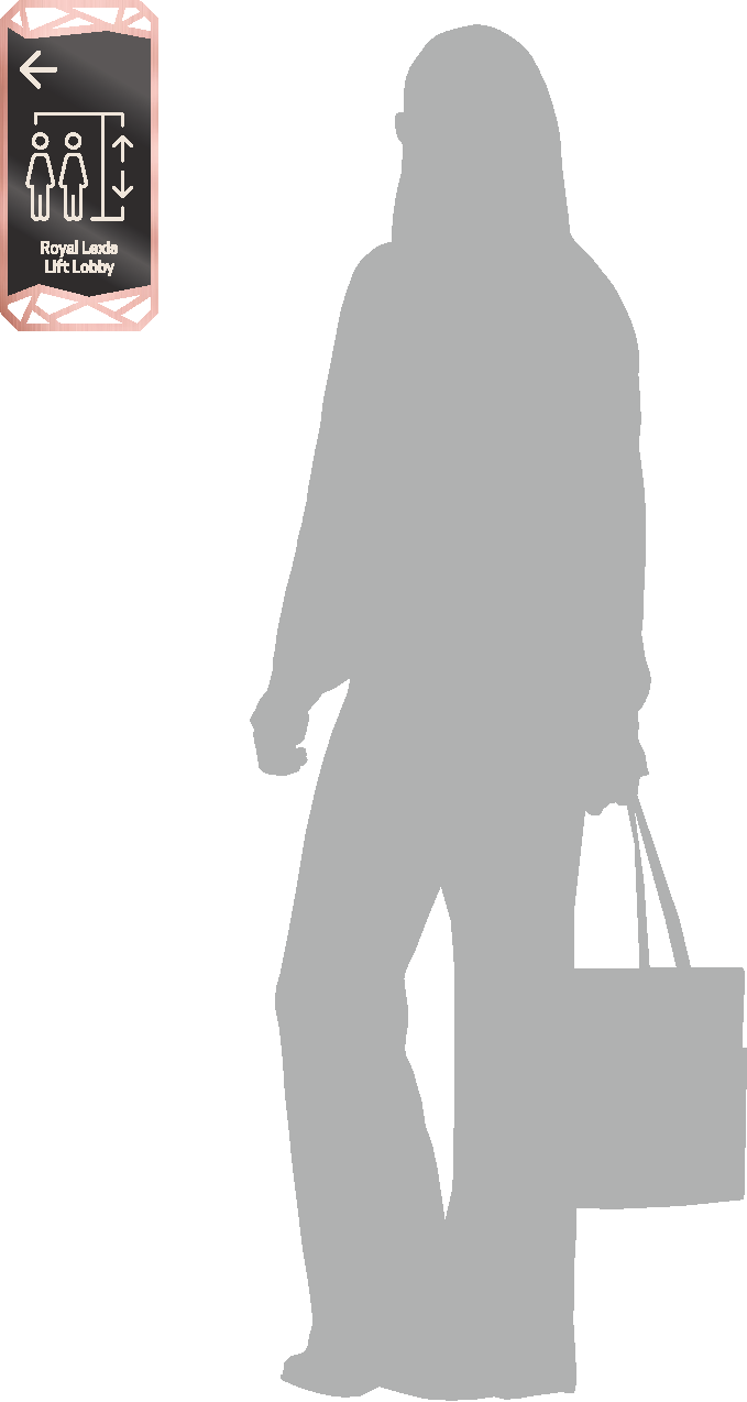 wayfinding signage featuring messaging icon and arrow in thick ivory white acrylic cutout main messaging panel in premium black mirror material surrounded by 10mm thick rose gold stainless steel frame with fine hairline finish precisely mounted flush on textured architectural wall realistic shadows and reflections on surrounding surfaces internal signage mounted on the wall of a 5 star hotel lobby