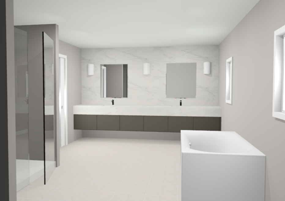 change wall scones to black add simple decor to vanity add wall tile to shower add black shower head to shower add towel to jaccuzzi tub