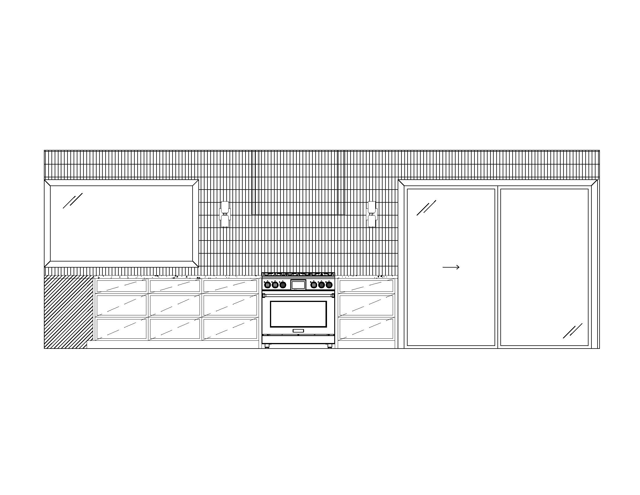 modern eclectic kitchen with curved hood tiled in same matchstick mosaic tile as backsplash