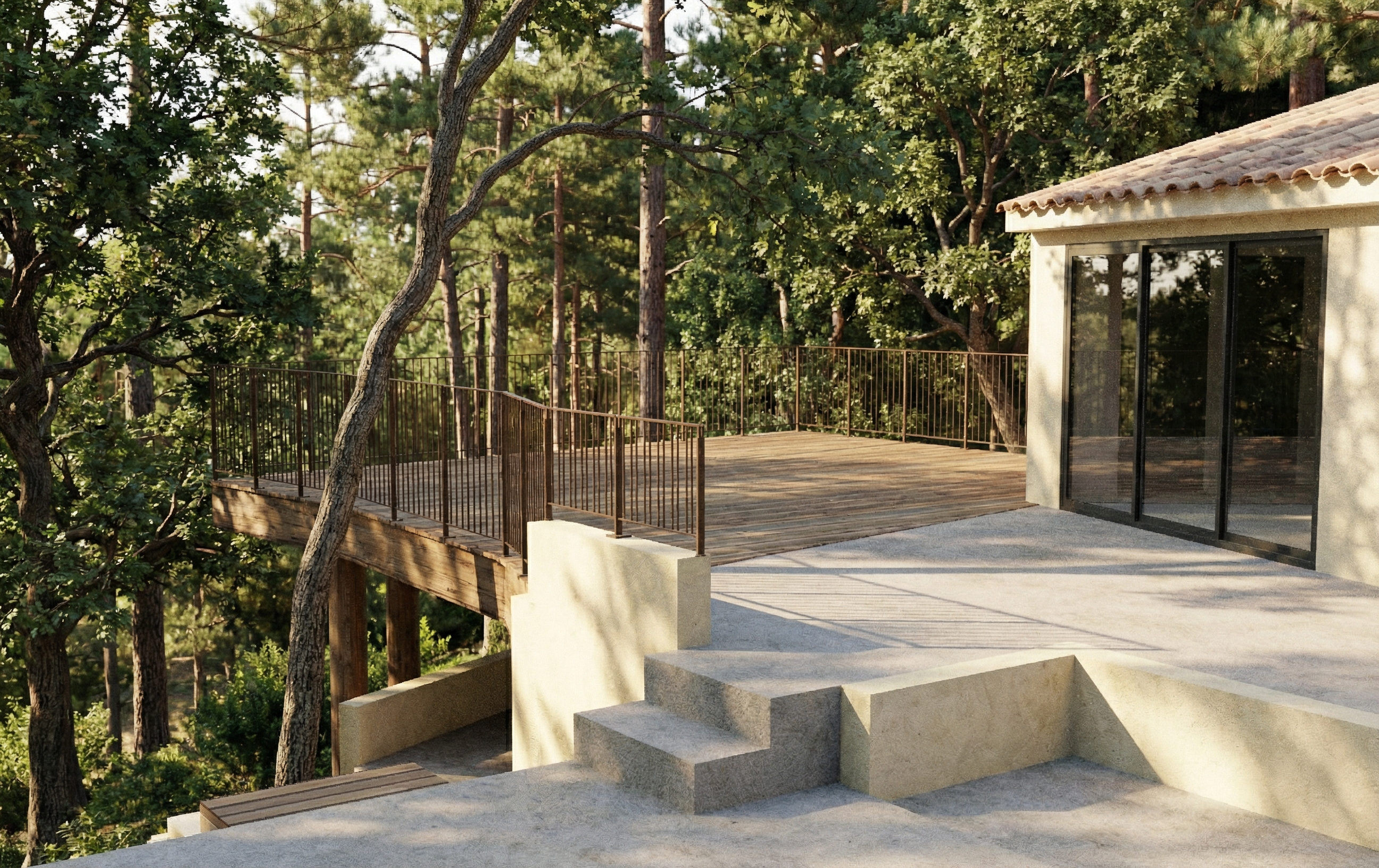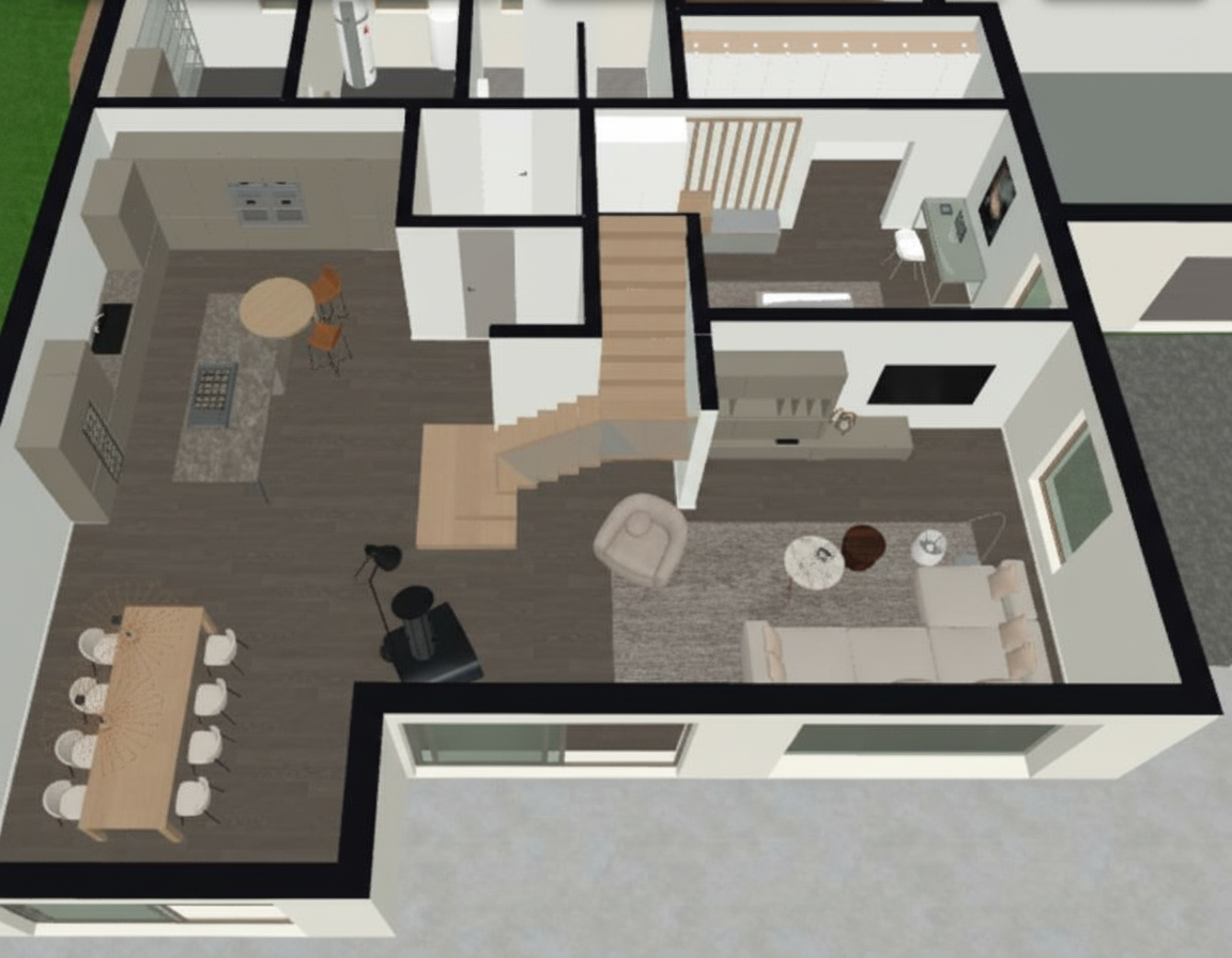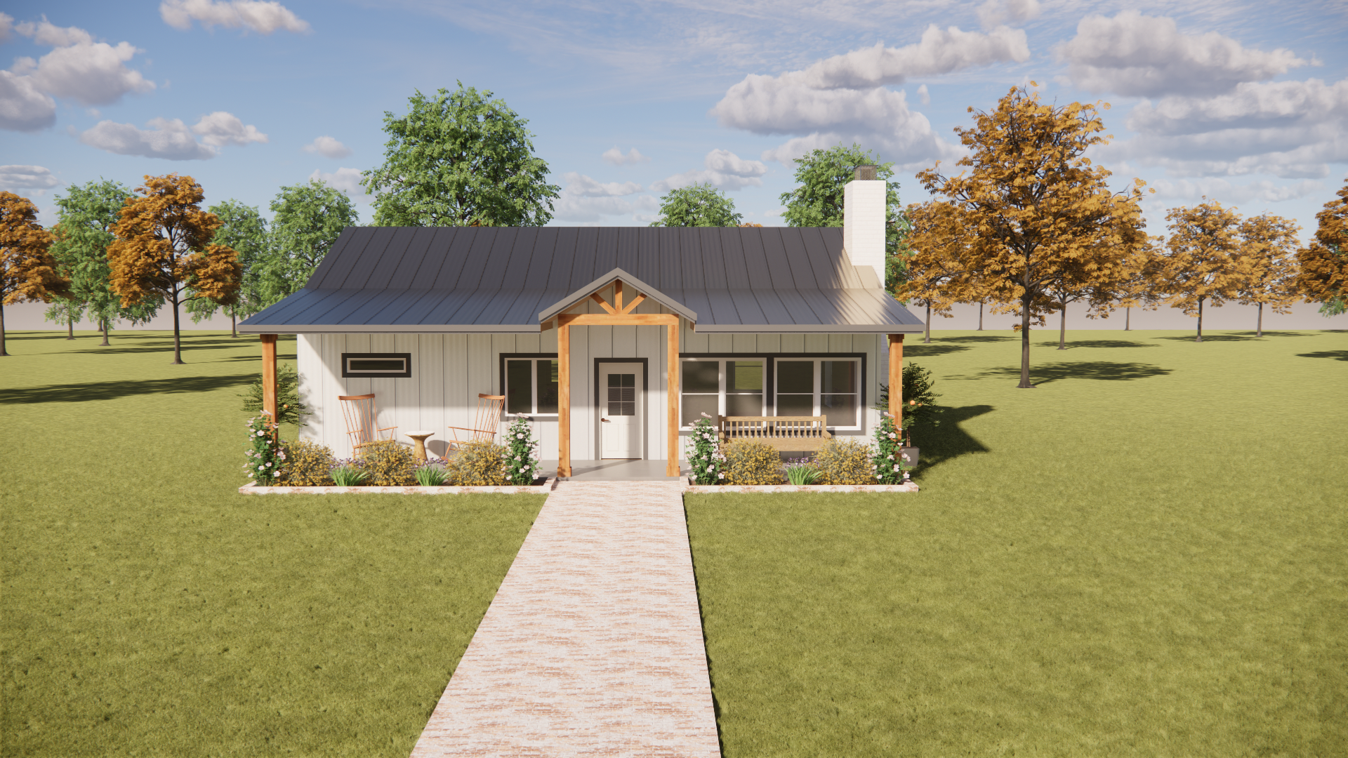 you are a professional image renderer you create the highest grade renderings around and specialize in architectural renderings this is the front elevation of a house create a high resolution photorealistic image of this structure keep the windows as they are where they are keep the doors as they are where they are keep the main structure as it is where it is feel free to change the perspective keep the roofline as it is where is it do not add anything to the structure that i have not asked for the roof is copper metal the siding is hunter green metal with cream accents the chimney is white brick the front door will be wood the background will be woods of maine it should be late afternoon with a cloudy skies the landscaping should be fall with an abundance of autumn color and should be that of a luxury estate