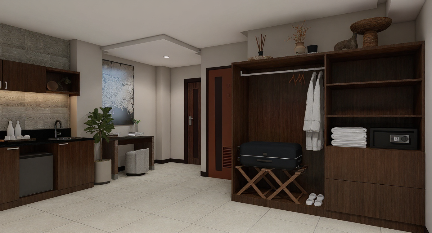 create a beautifully rendered modern living area use a soft warm color palette with ecru matte flooring the walls should be a sophisticated light grey and the cabinetry in ecru with wood accents keep concave panels on tv back wall incorporate black metal accents in the furniture and fixtures for a chic contrast ensure the atmosphere feels inviting and cozy with soft lighting to enhance the warm homely ambiance keep all original color of materials add subtle sunlight add background of garden with pool outside windows