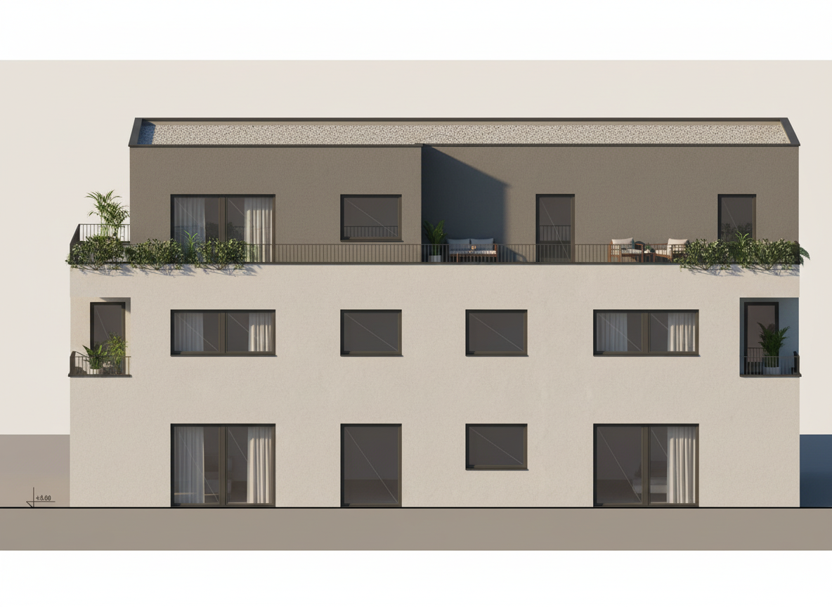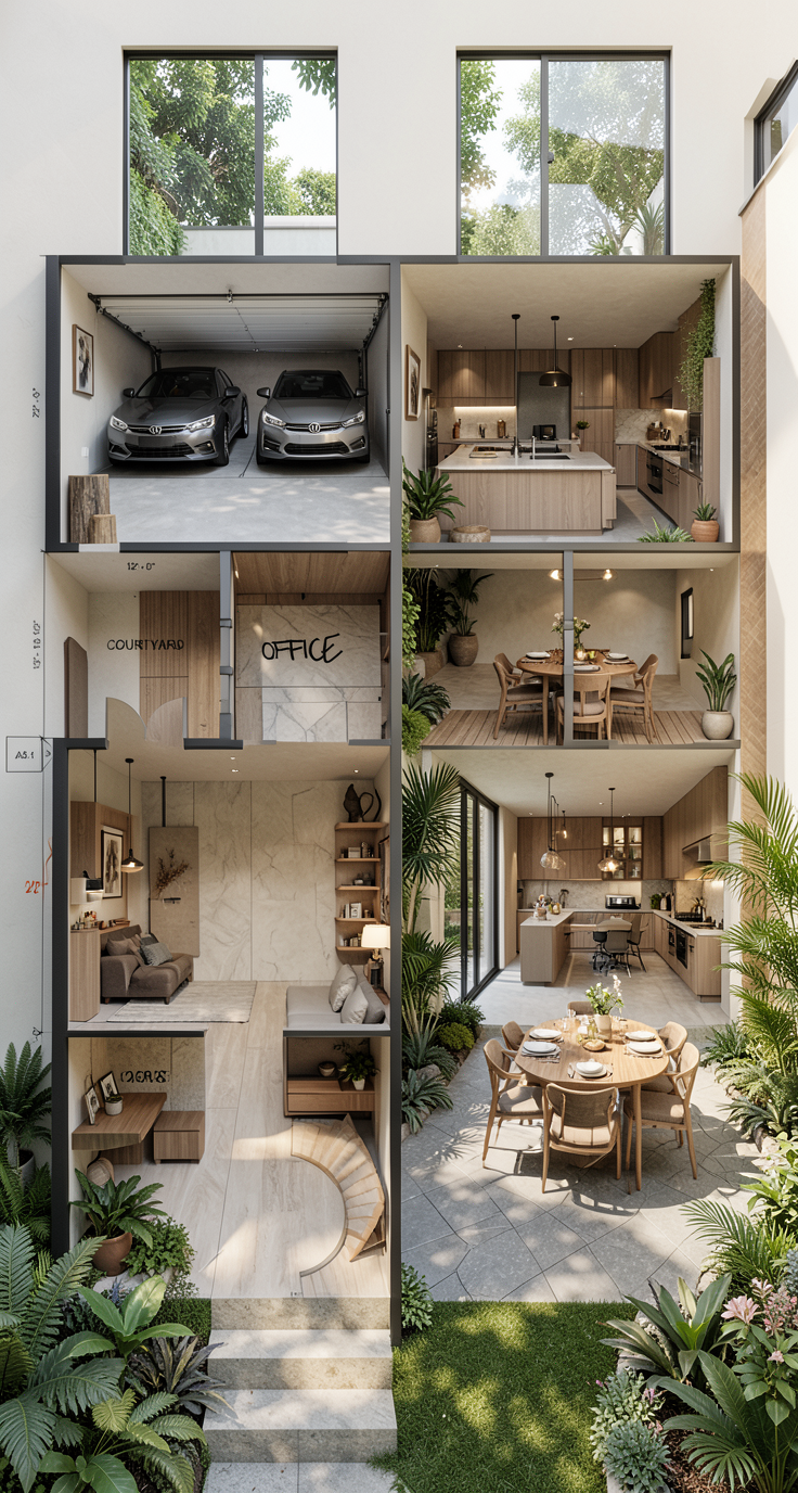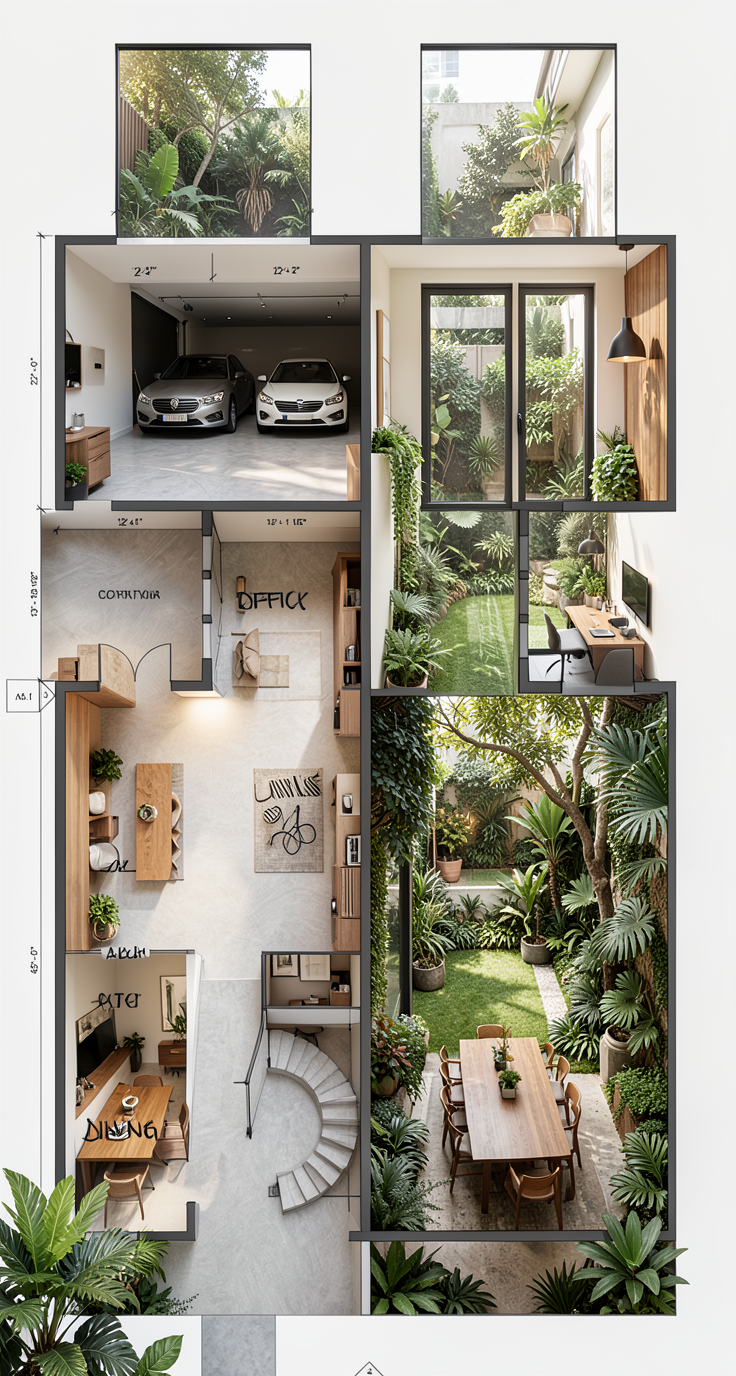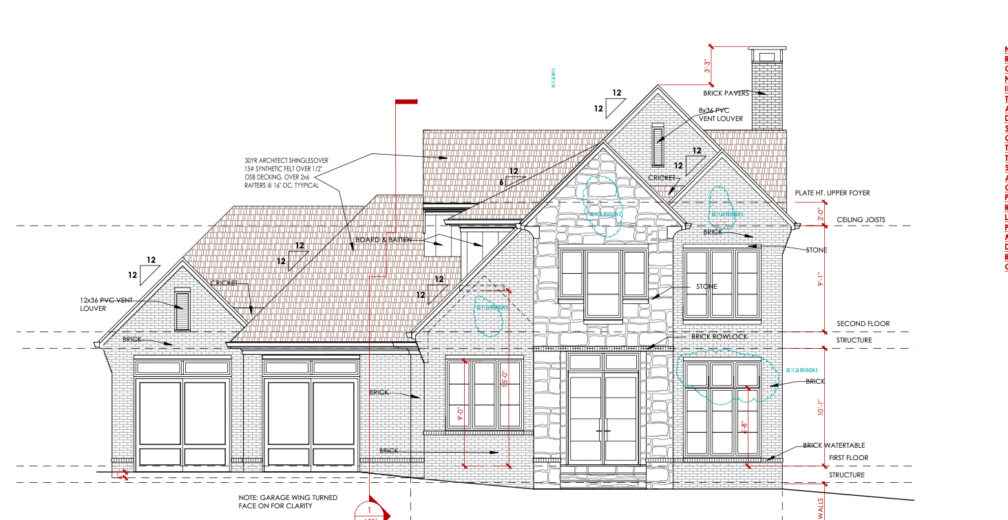 create a color image of this drawing with gray brick dark gray stone black roof and black framed windows add trees around the house