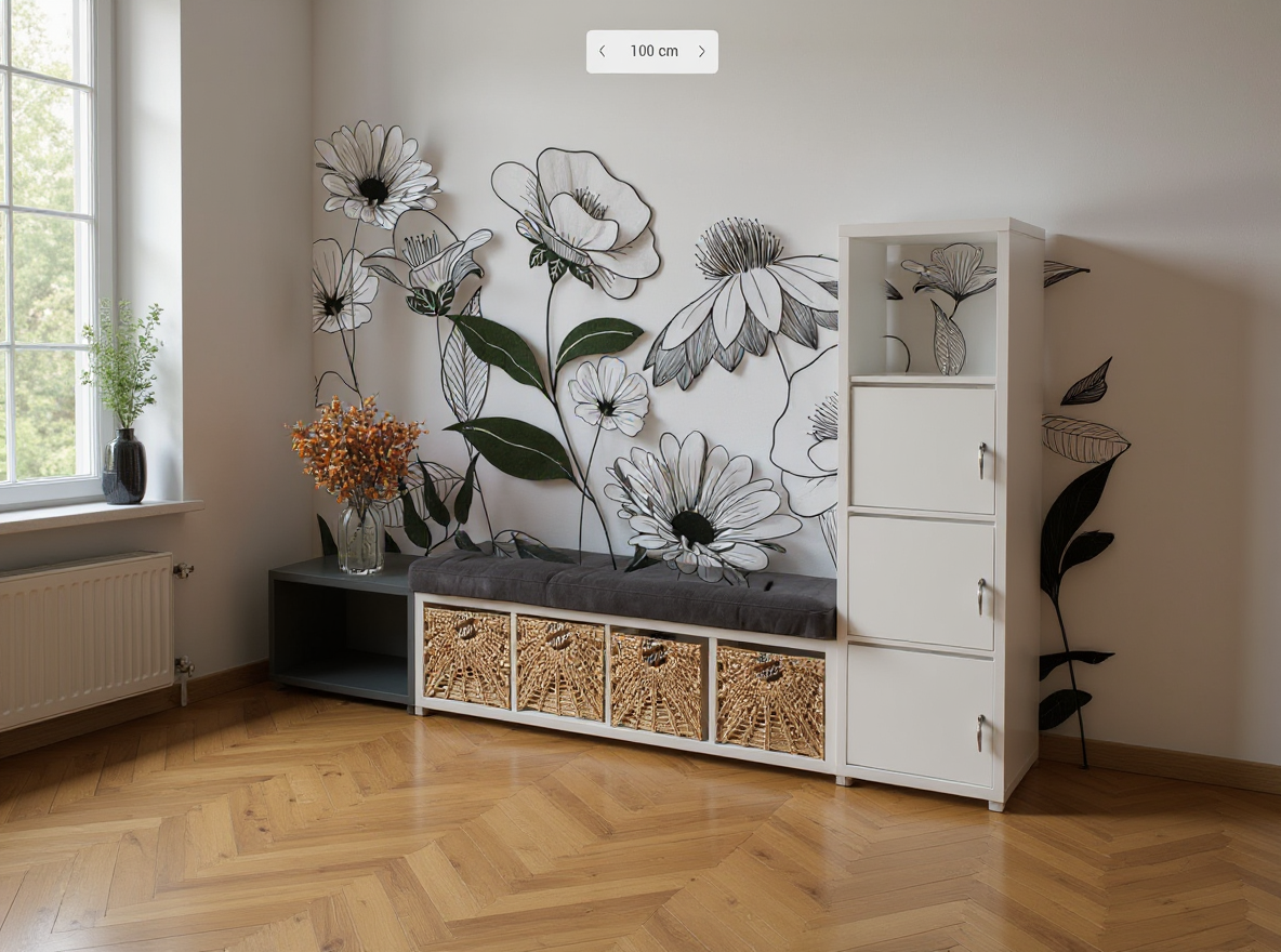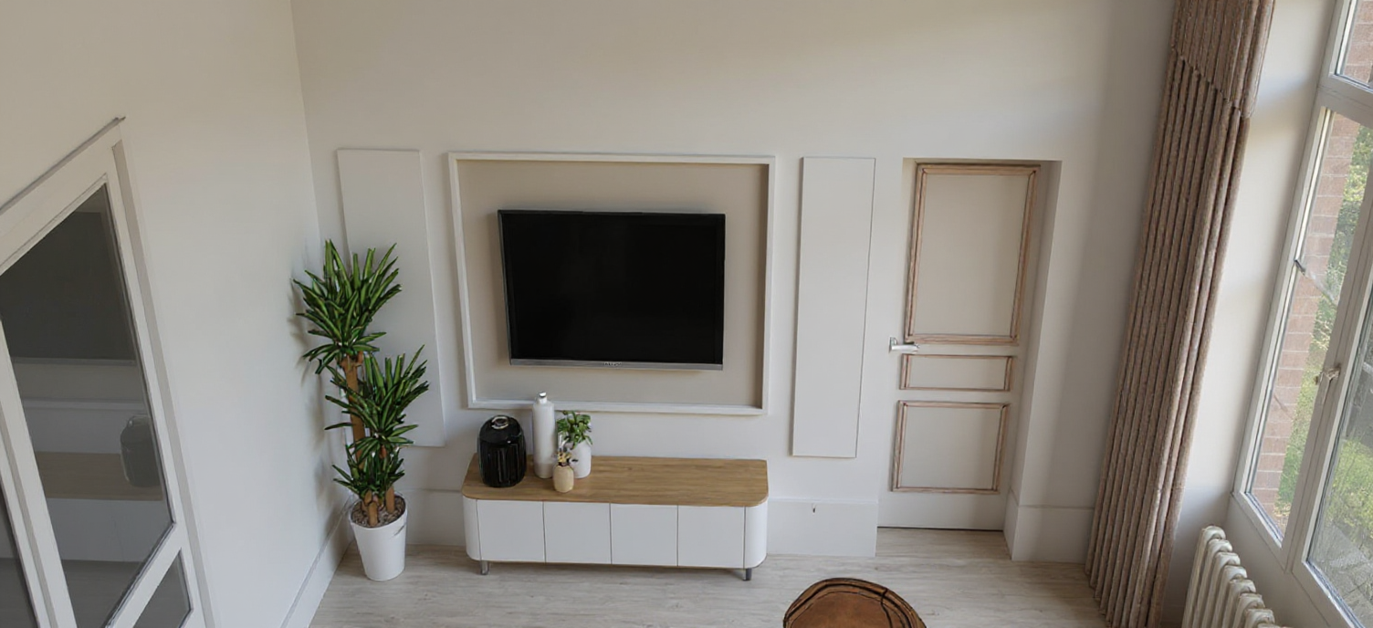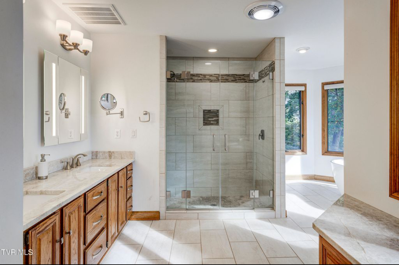 paint ceiling walls trim base benjamin moore white dove add weathered white zellige 2x6 cle tile to shower add limestone calacatta marble check flooring add curtain panels to windows in light linen fabric add woven shades to windows mullions remove vanity light add aged brass sconces remove mirror replace with white plaster mirror change countertops to carrara marble paint the vanity benjamin moore boothbay gray change shower floor to calacatta 1 marble penny tile add same countertop material to shower threshold replace plumbing fixtures with polished nickel remove overhead light and replace with incandescent lighting