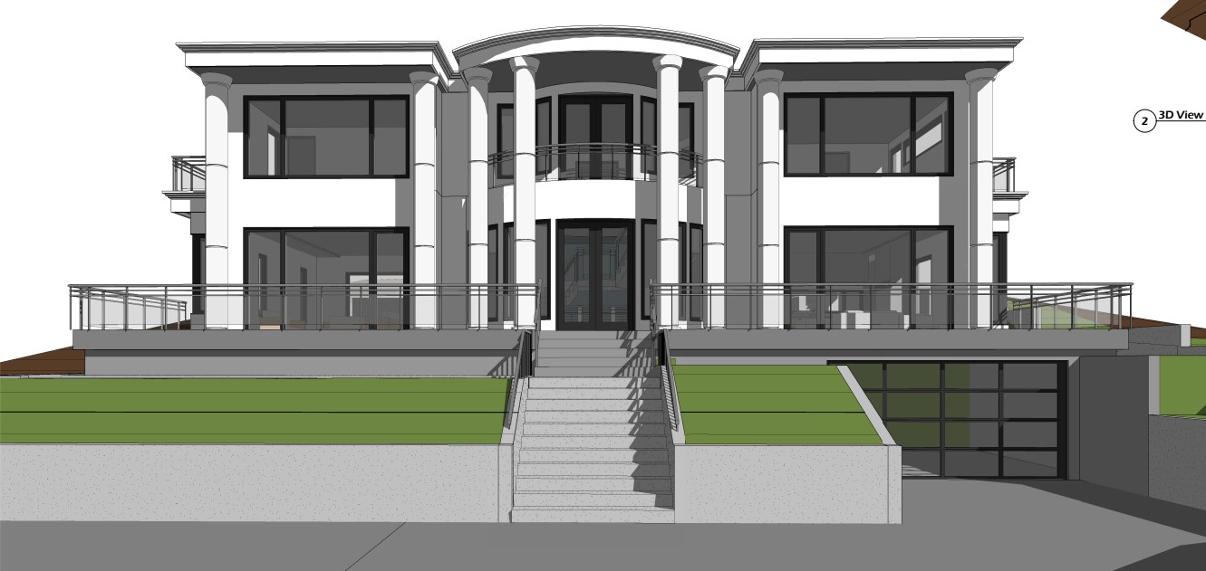render a luxurious mediterranean style and neoclassical mansion with grand columns and expansive glass windows the exterior walls are a pristine white contrasting elegantly with dark gray window frames the surrounding landscape features lush sections of lavendar hydrangea and green lawns and a staircase leading to the entrance with textured gray steps the atmosphere is warm and inviting bathed in the golden light of a late afternoon sun casting soft shadows that highlight the architectural details the sky is a clear azure blue enhancing the bright and airy ambiance of the scene manicured french style topiary and landscaping