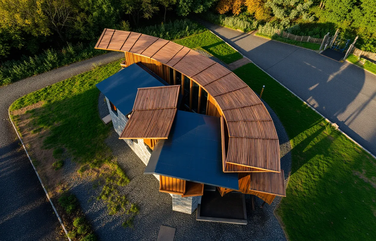 use wood stone concrete material coziness and greenery set in the evening with soft gentle sunlight make it a community center make roofs curvy concave