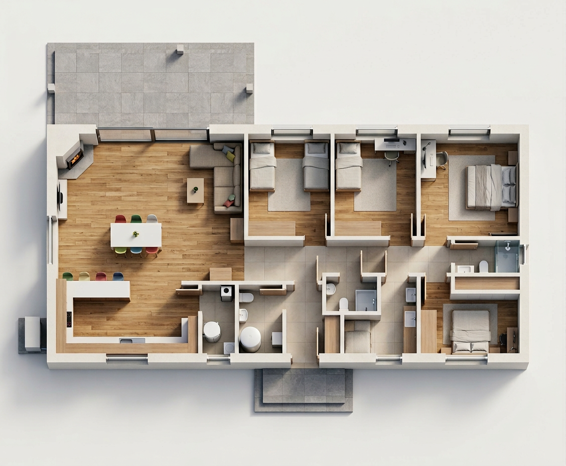 create a high end photorealistic 3d render of the provided living room image maintain the exact layout proportions furniture placement and overall structure do not modify or redesign any elements focus only on enhancing realism through advanced global illumination and soft natural lighting daylight coming through sheer curtains physically accurate materials soft fabric matte walls polished wood subtle reflections on glass and metal realistic shadows ambient occlusion and light bounce high resolution textures with subtle imperfections fabric weave wood grain variation slight surface irregularities depth of field and cinematic camera settings clean but realistic styling avoid overly perfect or plastic looking surfaces subtle color grading for a warm modern interior aesthetic output as an ultra realistic high resolution render suitable for interior design presentation