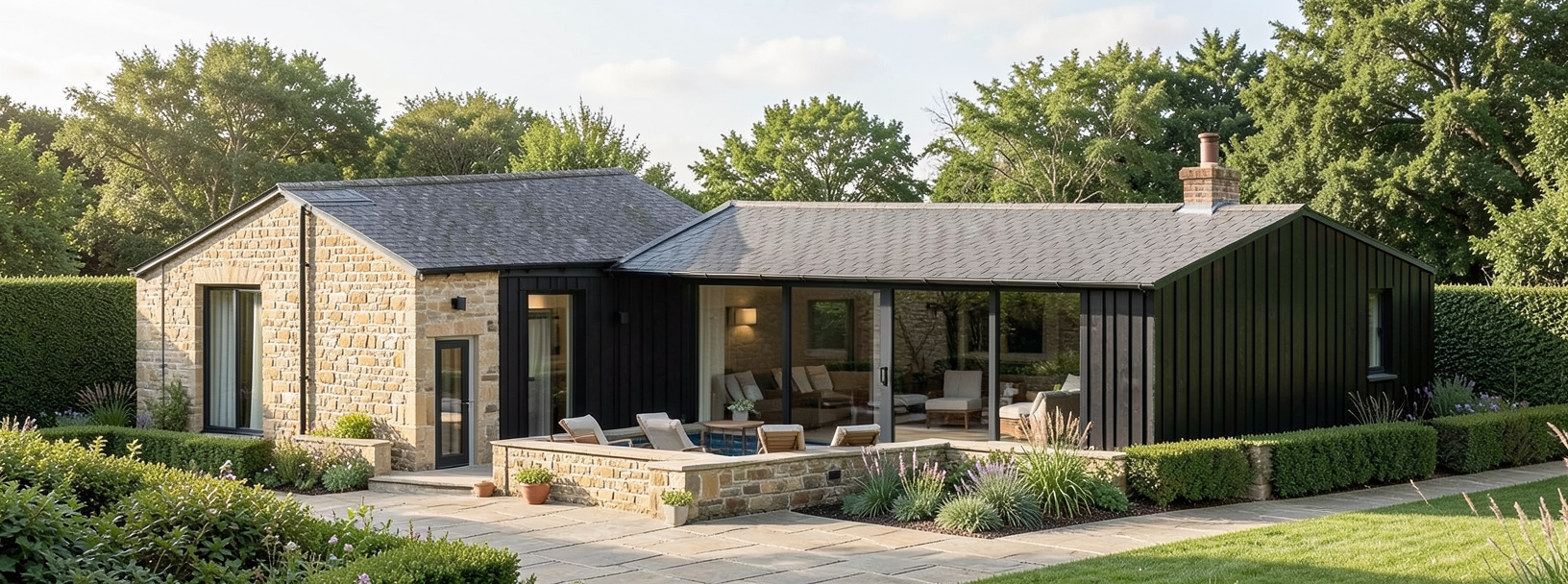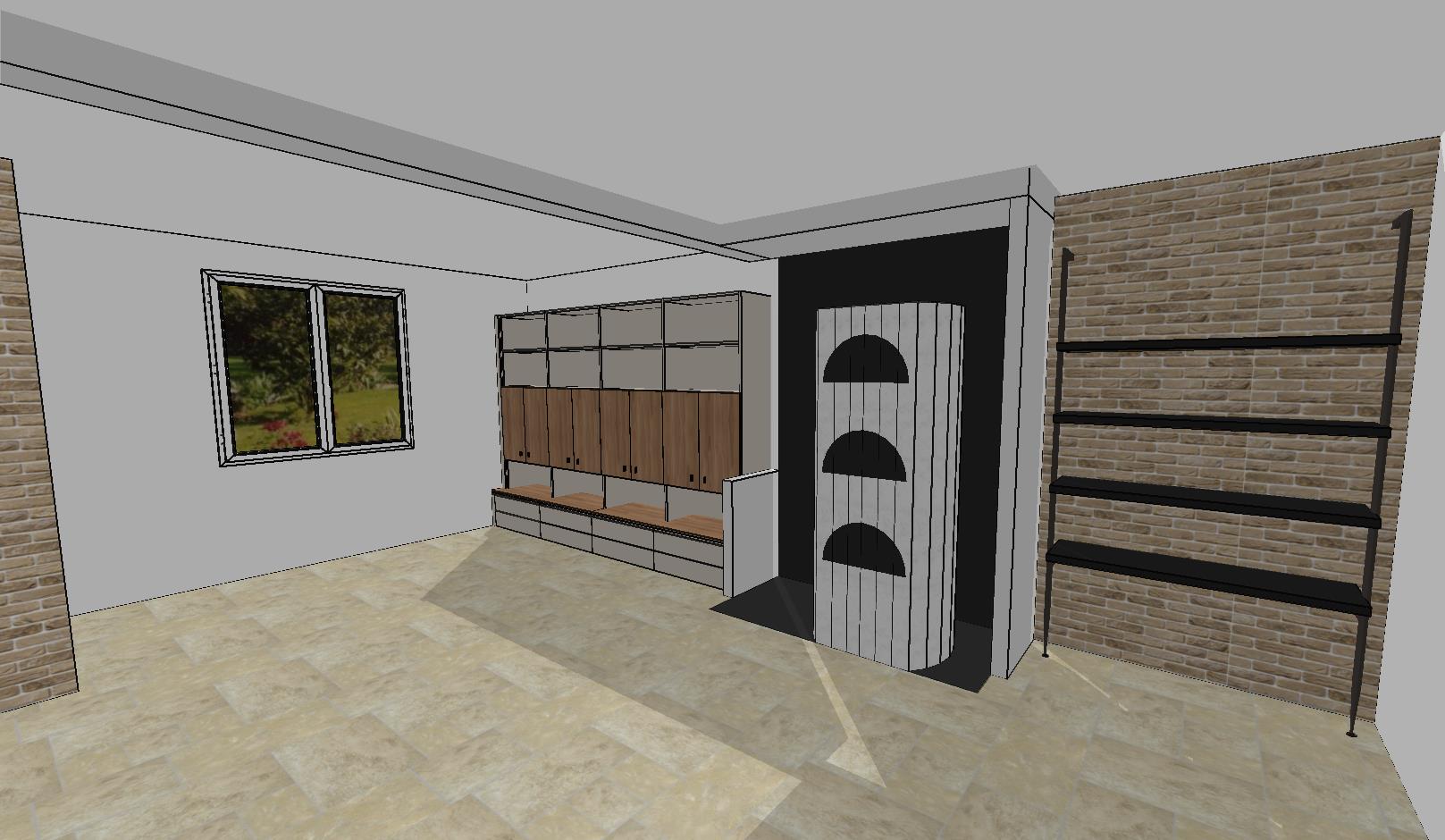 interior design of a modern living room featuring an elegant partially open shelving unit with a natural wood finish for warmth the walls are adorned with a textured light beige brick pattern complemented by a darker gray accent wall for contrast the floor is covered in polished light cream tiles with subtle marbled patterns for a sophisticated look soft ambient lighting creates a cozy atmosphere with sunlight streaming through a large window framing a lush green landscape the overall color palette blends earthy neutrals with a hint of warmth include hints of greenery peering through the window to enhance the serene atmosphere